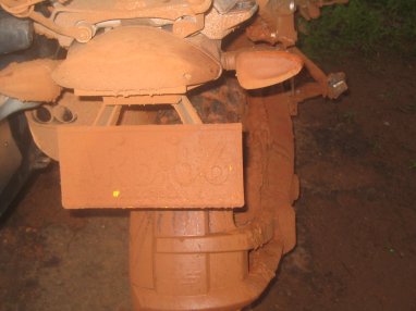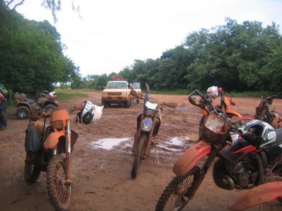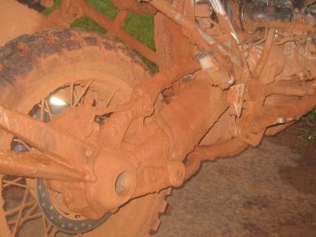 El asfalto, que solo llega hasta un poco mas alla de Puerto Lopez, se acabo muy pronto. Comenzo la fiesta. El terreno destapado hasta Puerto Gaitan estaba bastante complicado, pero sabroso. Un barro delgado sobre el piso firme de una carretera que ha recibido muchas mejoras de cuchilla pero que igualmente se ha deteriorado repetidas veces con el paso de carrotanques que sacan petroleo de la zona. Llegue a Gaitan con casi dos horas de diferencia, anticipandome a las camionetas y trailers. Sin embargo, faltaba lo peor. De Gaitan a Carimagua el terraplen llanero y la lluvia pertinaz presentaba otro estilo de barro totalmente diferente. Mucho mas grueso y pegajoso, gredoso; se adheria a las llantas y de nada servia el labrado de las famosas llantas Continental, de enduro, que le habia metido expresamente para este viaje a la BM. Fue una travesia tenaz !! Cuatro horas de tension, derrapando y deslizandose mucho, esperando el porrazo cada 20 metros, complicandose al final, ya a oscuras, pues no era facil escoger la mejor trilla (llegamos casi a las 9:00 PM). El resultado es este: