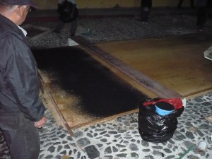 Las alfombras ó tapetes las hacen en diferentes estilos y materiales. Los mas comunes y llamativos son hechos con aserrín tinturado. Arman una formaleta rectangular (como dirían los arquitectos) con una base mas o menos firme de aserrín dándole el color base.