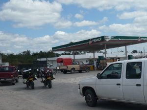 La carretera desde Escórcega a Yucatán está conformada por unas rectas muy prolongadas en una zona medio selvática y plana, caliente. Salimos sin desayuno, porque la calidad del hotel donde nos quedamos no alcanzaba ni para eso, pensando en encontrar algo en el camino. Sin embargo, la región es muy poco poblada, al punto de que en un buen trayecto de casi 200 kms no se consigue ni siquiera gasolina. Aunque estábamos avisados, nunca pensamos que fuera a ser tan crítico. Estas motos, como muchos carros modernos, tiene un indicador computarizado el cual, al bajarse el nivel de combustible a mínimos, le va indicando al conductor cuantos kilómetros le quedan de vida, antes de tener que bajarse a empujar. Pues bien, a Mauricio se le acabó primero el contador que el combustible. Empezó a marcarle que le quedaban 10 Kms, que le quedaban 5 Kms. y finalmente que ya no le quedaba nada !! Pero seguimos dándole, pues no había otra salida. Mi moto, por alguna razón, consume un poco menos y me indicaba que aun me quedaban algunos kilómetros. Ya cuando pensábamos, con un poco de angustia, que la varada en medio de la nada iba a ser desastrosa, se nos apareció la Virgen en forma de Pemex (y que nos perdone Arturo las blasfemias!!), aunque con una filas largas, por supuesto.