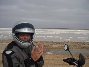Al dia siguiente fuimos hasta Guerrero Negro, 500 kms al norte y sobre la costa oeste y ahí comenzaron las luchas con el frío. Alla se encuentran unas famosas salinas, explotadas con mucha tecnología, retroexcavadoras y tractocamiones que arrastran un tren de tres enormes tolvas de no cuantas toneladas cada una. Esta empresa, que dicen ser la industria salinera mas grande en el mundo, es una interesante combinación de explotación industrial y conservación de la naturaleza, pues se desarrollo en los salitrales de la Laguna Ojo de Liebre, comunicada con el océano, a donde vienen cada año desde el Artico las ballenas grises a aparearse y tener sus ballenatos. Lamentablemente, en el tiempo que estuvimos no se dejaron ver, pues muchas ya están de regreso a casa.
