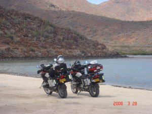En algunos de los valles que se forman tienen agua y eso cambia sustancialmente todo. Hay mas vida, gente, cultivos de uva, poblaciones. Hay sin embargo grandes extensiones inhabitadas, al punto que tuvimos que llevar gasolina extra en un bidón para poder llegar. Un tramo en especial tiene 350 kms sin un alma… La otra cuestión es que nos cambio drásticamente el clima. Se nos acabó la dicha del calorcito tropical (el trópico de Cáncer lo pasamos hace rato, un poco al norte de Cabo San Lucas), que indudablemente para viajar en moto es lo mejor. El frío vino acompañado de unos vientos intensos y constantes, con los cuales se hace mas difícil disfrutar el paisaje por cuanto hay que estar mas pendiente de la moto y el manejo. Por otro lado, esta parte de Mexico es muy grande. Ya les decia que son mas de 1.500 kms de punta a punta, los cuales hicimos en tres jornadas. El primer dia llegamos a Loreto, sobre el mar de Cortes, esto es, en la costa este de Baja. Los paisajes de mar y los colores que se ven en este tramo son indescriptibles.