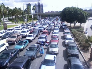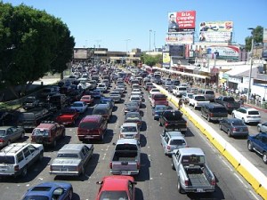 Salimos de Ensenada rumbo a Tijuana, domingo no muy temprano, por una superautopista que bordea la costa en buena parte de sus 100 kms. Al llegar a Tijuana, en lugar de meternos al centro, fuimos siguiendo las indicaciones de San Diego (USA). En un momento dado, desembocamos en lo que sería un trancón monumental, en una avenida de dos o tres carriles. En ese momento vimos a una «polis» mexicanas y le consultamos si esa era ya la entrada al control fronterizo. Nosotros no queriamos entrar de una vez, pues queriamos completar los tanques de gasolina y así cambiar los últimos pesos mexicanos que teniamos. Pero la «poli» nos fue indicando cómo meternos por un ladito, atravesando con mucha delicadeza unos maletines de concreto pintados de amarillo que ponen para organizar éste despelote e ir llegando, por no decir colándonos descaradamente, hasta el punto de control. Al avanzar notábamos con preocupación como otras avenidas van confluyendo al mismo lugar, taryendo cada una su propio trancón y gente desesperada que puede pasar fácilmente dos, tres y hasta cuatro horas haciendo esas filas.
