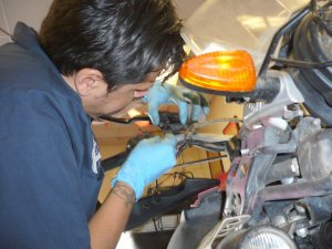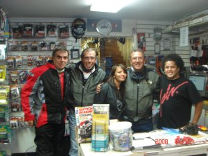 Mauricio no quería, en principio, hacerle nada a su nave. Realmente en México nos animaron a seguir con el mismo aceite de motor hasta Miami (de acuerdo al kilometraje que nos falta por hacer) y acá en LA nos reafirmaron que no era necesario cambiarlo de nuevo. Al revisar las llantas, el mecánico notó la trasera de Mauricio un poco baja de presión y algo mas gastada; cuando nos acercamos a darle un vistazo, le encontramos un puntillón de 12 cms incrustado !! «Bueno, entonces también dejamos ésta moto para despincharla…» — les dijimos. «No señor, negativo, no se puede…». Por problemas de demandas, seguros y abogados, ellos no despinchan, ni autorizan ó sugieren hacerlo. Es mas, ni siquiera dejó el Jefe, don Fernando, que alguno de los mecánicos de rango inferior, que en su espíritu solidario latinoamericano se animó a colaborarnos, nos ayudara a despincharla. Deberíamos hacerlo todo, si queríamos, por nuestra cuenta. Claro, la otra opción también estaba a la mano: llanta nueva…. Y después de tanto miedo que le meten a uno con el asunto de la despinchada y la posibilidad de tener problemas a alta velocidad en una autopista de éstas, pues Mauro acabó estrenando zapato trasero. En general nos atendieron muy bien; adicionalmente conseguimos ahí el repuesto mas urgente (un switch sensor del freno) y en su almacén de accesorios algunas bobadas de esas que siempre nos ponen a babear. Claro que también hemos visitados otros distribuidores en donde hemos conseguido el emblema que me habían robado y una que otra camiseta para mejorar estas pintas.
