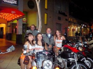 Como pueden ver, estábamos en Santa Mónica, exclusivo sector de LA. Paseando sin rumbo y buscando un lugar para comer, nos encontramos con una sorpresa adicional que nos traería este viaje. Ya en otras entregas hablamos de los fascinerosos y bandidos que nos podríamos encontar en el camino. Pero lo que nunca nos imaginamos fue que nos atacaran unas bandidas !!!!Llegamos a Hooters, de la famosa cadena de restaurantes, con especialidad en alitas y pechugas…. En ese lugar fuimos muy bien recibidos y tambien encontramos, cosa curiosa, unas personalidades nativas, muy contentas de oir nuestras historias de viaje. Y pueden estar seguros, mas contentos nosotros de contárselas. El problema fue bajarlas de la moto a esas bandidas !!