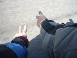 Nos divertimos mucho con Laura haciendo nuestro propio rito, para sacar los brazos al tiempo y estar perfectamente sincronizados en nuestro saludo a los otros viajeros de moto.
