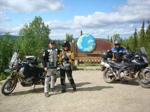 El camino es pavimentado y destapado de manera intermitente, y el único trafico que cruzamos era el de las inmensas tractomulas llevando equipo de un lado al otro entre las estaciones pretoleras. La única compañera fiel fué la tubería de petroleo que a orillas del camino va llevando el petroleo desde prudhoe hasta valdez. En esta etapa del viaje nos acordamos mucho del tio Gonza con sus intrépidas salidas al endurito, aunque esto lo hace muerto de la risa, lo tuvimos muy presente. La vista es muy impresionante, por suerte sigue haciendo sol. A medida que avanzamos el paisaje cambia, se dejan de ver pinos y se ve mas un paisaje de tundra, árido y desolado. Por fin llegamos al Yukon River Camp, el sitio en la mitad del camino entre Coldfoot y Fairbanks en el que se puede uno aprovicionar y tanquear. Al entrar a tomarnos una gaseosita charlamos un rato con un tipo inglés que iba hacia el sur en bicicleta y acampando! También sobre las mesas del restaurante leemos un librillo que cuenta la historia de cuando un oso grizzly decidió meterse dentro del Yukon River Camp en invierno e hibernar allí despues de hacer desastres. Lastimosamente en primavera cuando regresaron los del YRC se encontraron con el oso y lo tuvieron que sacrificar, envuelto entre toallas. Dicen que debido a los incendios forestales la comida de los osos escaseó ese año y por ende el desespero del oso. Después de lo propio seguimos viaje hasta el pequeño monumento que marca el cruce con el circulo polar. El paisaje es realmente espectacular, el camino, la tubería, todo lo hace único. Parece mentira estar ahí, llegamos!!! Pegamos el sticker, esquivamos algunos moscos e iniciamos el regreso al YRC.
