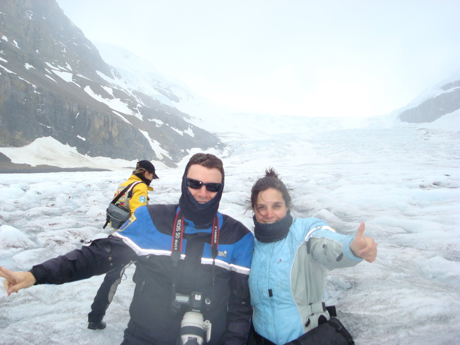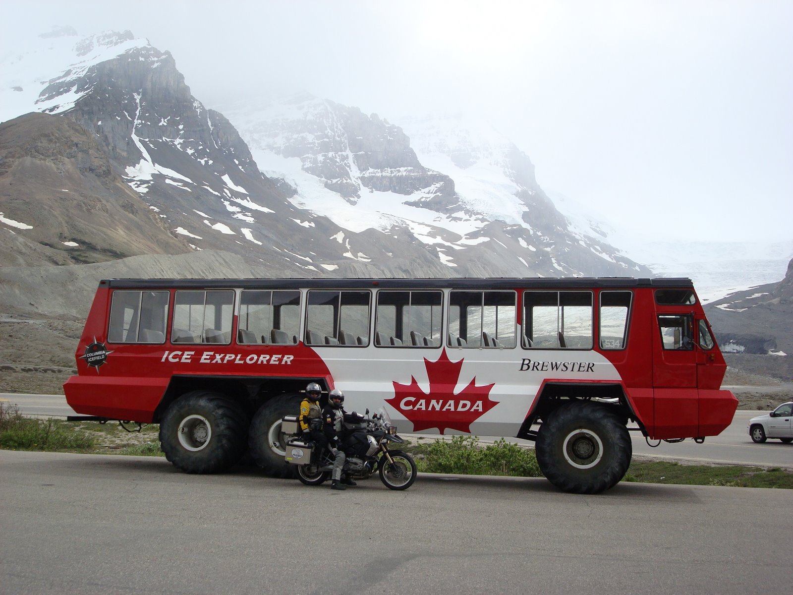 La ruta de Edmonton a Hinton es una autopista bastante recta pero entretenida.Llegamos con el tiempo suficiente para comer algo, dormir y madrugar a ajustar la tapa lateral de mi moto que como comente en la entrada anterior la dejaron suelta.Bueno no fue mayor cosa.Asi que arrancamos para Jasper y Banff.El Icefields parkway es un deleite para los ojos y la mente.No creo que pueda describir el escenario de montanias nevadas, graciares y campos de hilos junto a lagos de aguas azul- turquesa.Como se cuenta lo que se siente estar ahi?Imposible…Dicen que es el camino mas lindo de Canada y uno de los mas pintorescos del mundo…por algo lo dicen.Y aunque el clima no ayudo ya que a esa altura en las montanias el clima cambia rapidamente y tuvimos lluvia, alcanzamos a visitar el campo de hielo Columbia a bordo de un camion gigante con ruedas gigantes capaz de trepar una inclinacion de mas de 45 grados ,que se mete entre este mundo de hielo hasta quedar rodeado de hielo por todos lados.Otra experiencia a la que no le hace justicia ninguna descripcion.Solo un adjetivo se me ocurre:Conmovedor. No hubo palabras mientras estabamos alli, no las tengo ahora para contarlo.