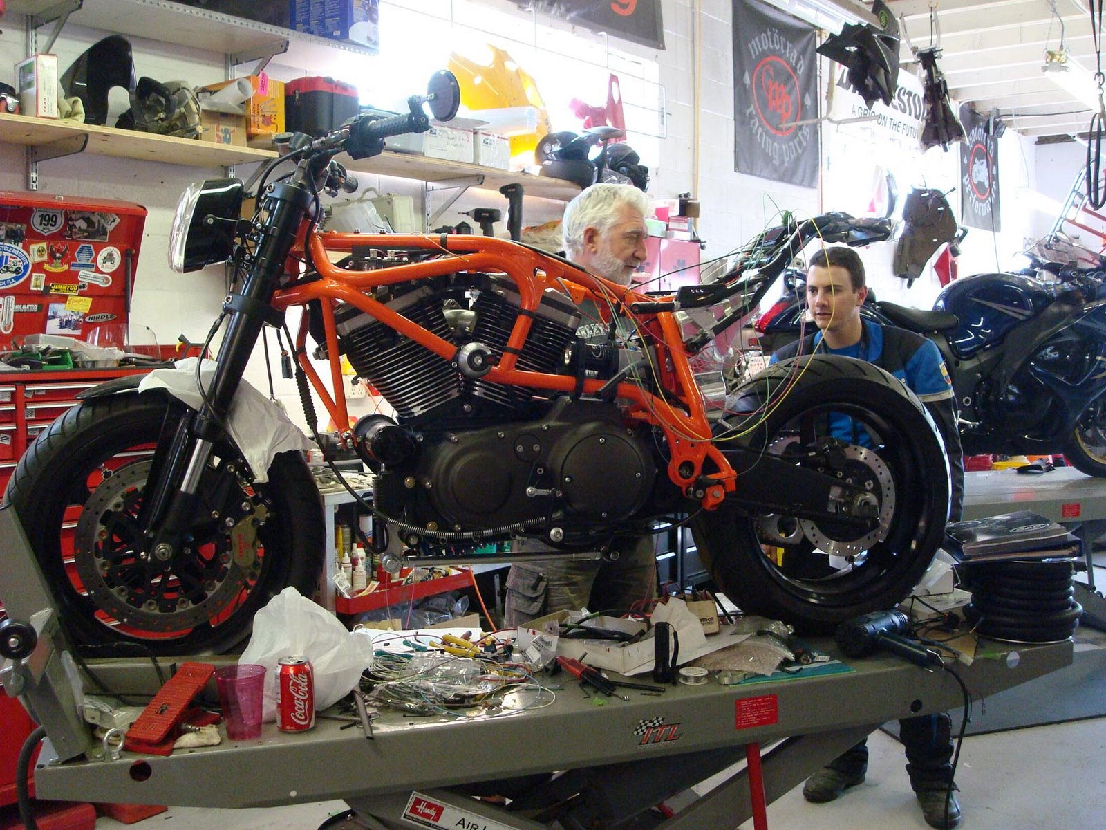 We arrived there, faithless. I didn’t even remove my helmet or gloves. I entered the shop and asked for service. That’s when we met Paul. He at first welcomed me, as if knowing we were in need of help. I asked if he sells tires, he says he does but doesn’t have the ones we require in stock. After a short conversation he suggests maybe we could get them at Blackfoot and get them to him so he can put them on the bike! I think that’s awesome. He even suggested he could put them while we have lunch so no time is lost. He reads our minds! He says he will charge us 60 bucks which is pretty expensive for us, but considering the situation we agreed. We go get the tires, bring them back to him and ask him where to grab some lunch. He points up the hill a pizza place that he goes a lot to. But its around 30 celcius and climbing up the hill seems like quite an effort. Especially with our bike clothes. Paul reads our minds ag