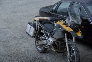 Las maletas de alumino fueron la mejor desicion, por espacio,y seguridad en el montaje.Nos cruzamos por ahi una R1200GS con un curioso sistema de montaje de las maletas extensibles como se ve en la foto.No tuvo ninguna caida: solo efecto del ripio.