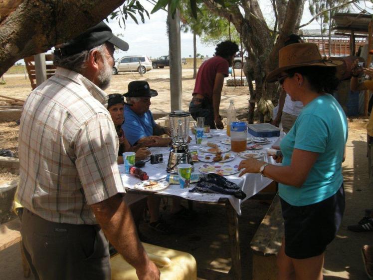 La gente en el llano adentro es muy generosa y desprendida. Conocedores de su situacion de aislamiento, cuando alguien llega a su casa no dudan en ofrecerles limonada en aguadepanela y si es del caso algo de comida, aun sin esperar nada a cambio. En la casa de abajo, Doña Ana su dueña, mantiene siempre algo en la cocina para los que puedan aparecer. En esta ocasion no eramos sino 14 y para todos hubo un pedazo de carne de chigüiro, platano sancochado, arroz.