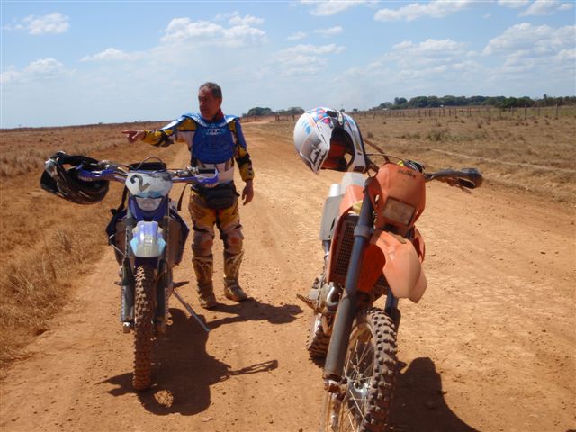 Pero en fin, el viaje de la Aventura Tuparro debía seguir y no se iba a dañar por pendejadas. Sin embargo, pueden creerme que en los siguientes 5 kilometros estaba por desistir. Javier Rugeles con Clarita, en su poderosa camioneta Nissan y Daniel Reyes con Juanita, salieron como alma que lleva el diablo por un camino equivocado, rumbo a la granja experimental Gaviotas y al Guainía. Arturo pinchó la llanta trasera de su KTM al salir a buscarlos y regresó sin haberlos alcanzado. Alejandro Vargas con su familia, pasó de largo por el camino correcto, sin enterarse de la perdida de los otros y no lo volvimos a ver hasta el destino final, La Primavera. Rafa Ibarra no se arriesgó a perseguir mas a los Vargas porque se quedo sin gasolina y regreso con el tanque de reserva… Que mas podria pasar ??