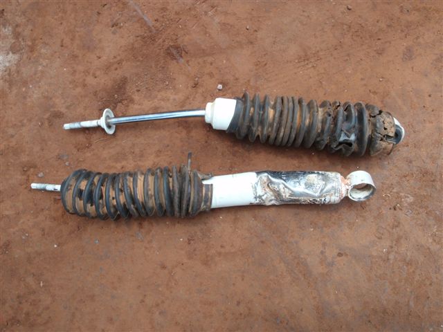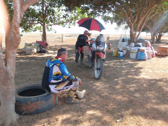 A continuación, llegando a Carimagua, con unos 120 kms de tortura en esta trocha mi BMW reventó el amortiguador trasero. Aunque no queda totalmente inservible pues la suspensión lleva tambien un muelle ó resorte envolviendo el amortiguador como tal, si queda como una liebre ó como un canguro saltarín. La llanta trasera rebota en cada hueco muchas veces, similar a un balon de basketball. Con mucha resignación y en una frustración total, dejé mi moto al cuidado de Don Fabio, el propietario de una tienda del camino, frente a Carimagua. Pasé a ser pasajero de la Dodge Dakota de Rafa que conducía Mauricio Castro y a ver los toros desde la barrera, mirando con envidia como sufrian mis compañeros de moto. Es como cuando un papá le dice al chino: «Camine mijo, lo llevo al centro comercial a ver comer helados…»