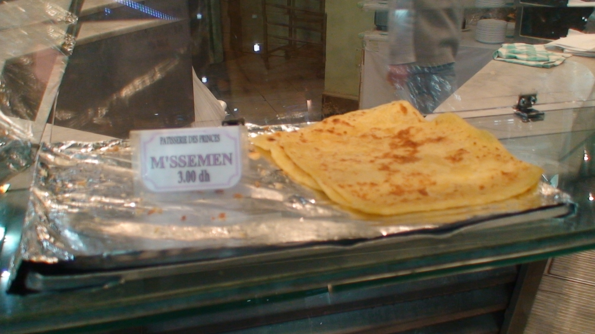 El desayuno tiene invariablemente jugo de naranja (nada parecido a lo conocido), pan “Khoobdz” queso de cabra y aceitunas y un especie de pancake (parece una arepa de lejos) y un pan medio imposible de describir: M´ssemen. Una masa delgadita casi como una telita, doblada varias veces sobre si misma hasta formar un rectángulo, cocinada sobre una matera que tiene fuego por dentro o sobre una plancha. Es bastante aceitosa.