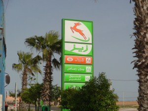 Hay estaciones de servicio por todas partes y no es mala idea ir tanqueado porque algunas eventualmente no tienen combustible. El cartel de la estación es visible desde lejos (Afriquia, Sizz,OilLybia) supermoderno, pero de cerca lo único moderno es el aviso…Muchas trabajan 24 hs. Eso dicen los carteles, no nos consta.
