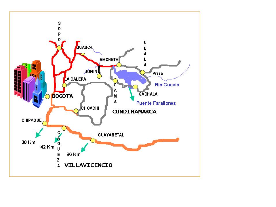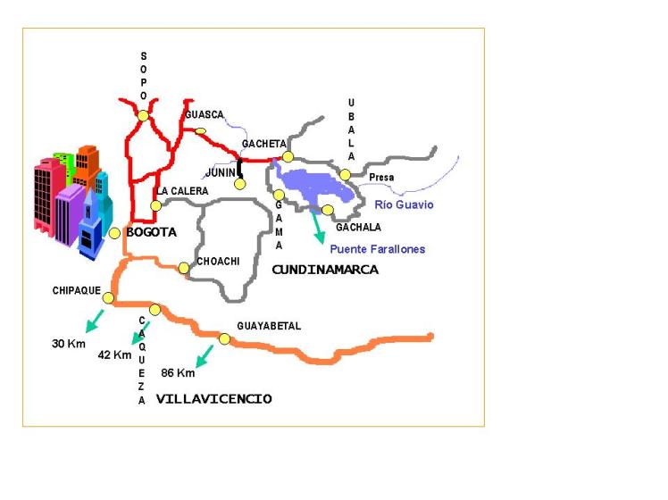 El paseo hasta la Represa del Guavio se hace en 3 horas y media, aproximadamente. La carretera NO es de las mejores, pero el paisaje compensa el mal estado de la misma. El regreso por la poblacion de Gama, pasando por el puente del «bungee» es destapado, pero no muy complicado.