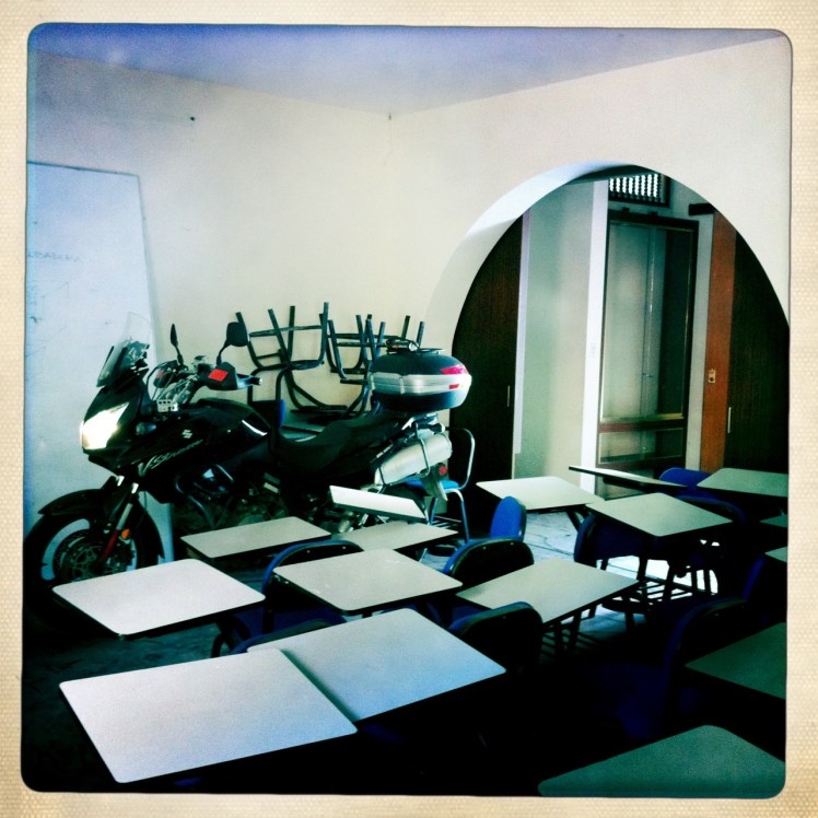 Hoy temprano al poner las cajuelas Julio se dio cuenta que faltaba un tornillo soporte donde descansan las maletas laterales Givi. Son las 7.45 AM en Mancora. Despues de una pequeña inspección nos dimos cuenta que en realidad el tornillo se rompió. Parte del tornillo esta adentro del soporte y parte en algún lugar de Ecuador. Trate de sacar el tornillo con alicate y hombre solo pero fue imposible. Ademas el tornillo extra que traía ya esta en el protector de la quilla así que no había mucha opción. Al analizar lo sucedido mas otra serie de sucesos en los dias anteriores, consideramos muy probable que las cajuelas estuvieran muy pesadas. Después de ver a Julio y a Andrea con múltiples pintas durante ya 6 días, eso era una primera pista. No hay que ser muy perspicaz. Al comentarle esto a Julio nos dijo que no creía que estuvieran tan pesadas, sin embargo en el hotel nos prestaron una balanza: 15.8 kg la una y 14.6 kg la otra. Muy pesadas para esa moto!! Una caja de 6 o 7 kg ya va en camino a Bogota. Mientras ellos empacaban la encomienda fui en la moto de Julio a Osaka casa de cambio y distribuidor de repuestos para moto taxi donde su propietario acababa de abrir. Me recomendó el taller grande de Lama. Me metí por el barrio de arena y rancherías buscando el taller. Toda la gente muy cordial me fue guiando sin problema hasta la ranchería del taller Lama. Habían como 5 moto taxis deshuesados afuera y como 200 adentro entre pollos, gatos, medias, calzones, perros y operarios del taller. El señor Lama, un tipo alto grande de pelo hasta los hombros con aceite hasta en las orejas, se levanto a recibirme con cigarro en mano y gafas a media nariz. Un tipazo: le mostré lo que nos había pasado y a su ritmo desmonto el soporte lo calentó saco el tornillo puso uno nuevo con arandela y listo. Todo esto tomo unos 45 minutos. Mientas, me contó que a un amigo colombiano le fabrico la corona, para la cadena de una Ducati, a pulso! tambien dijo que hacen ahí moto taxis, que ha recorrido todo Peru en camión etc… un bacán. Al final, me paso cuenta de cobro: dame pa una cerveza. Pobre Julio, yo solo tenía 20 soles en el bolsillo. Arrancamos entonces, tarde nuevamente como siempre, hacia Trujillo. Despues de algunos kms nos agarro un viento fuerte de lado. Seguimos dandole con esfuerzo, pasamos Piura y ahi el viento ya era cosa seria.