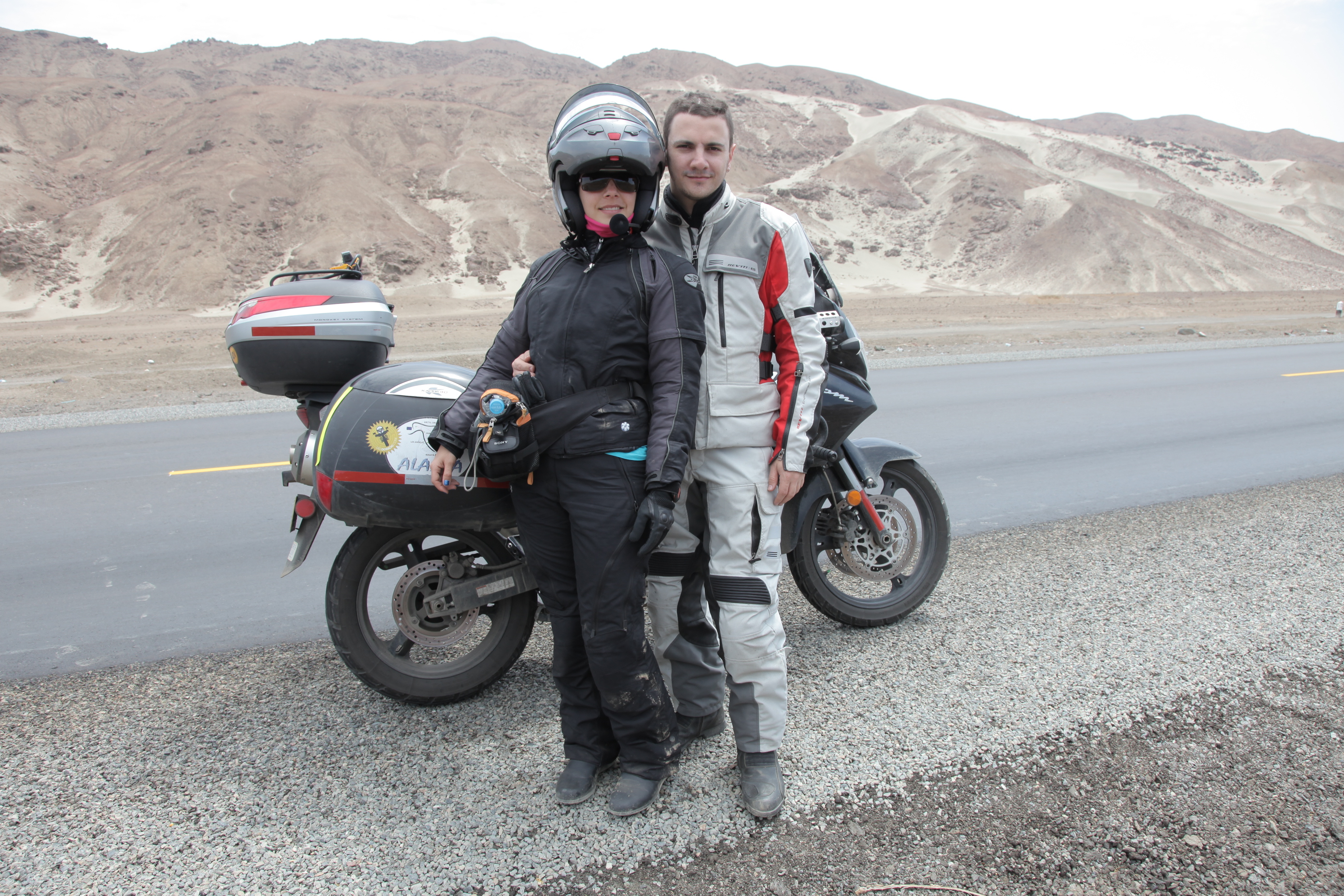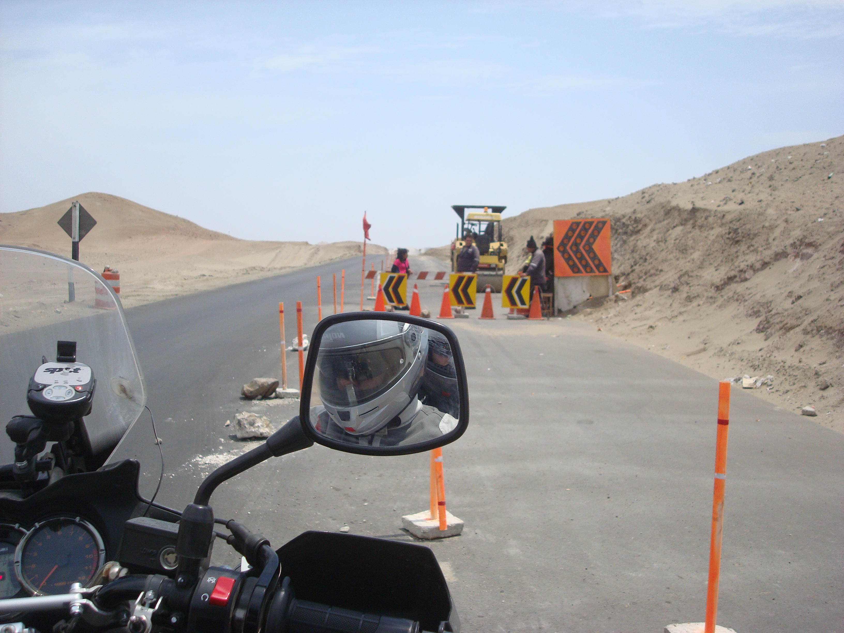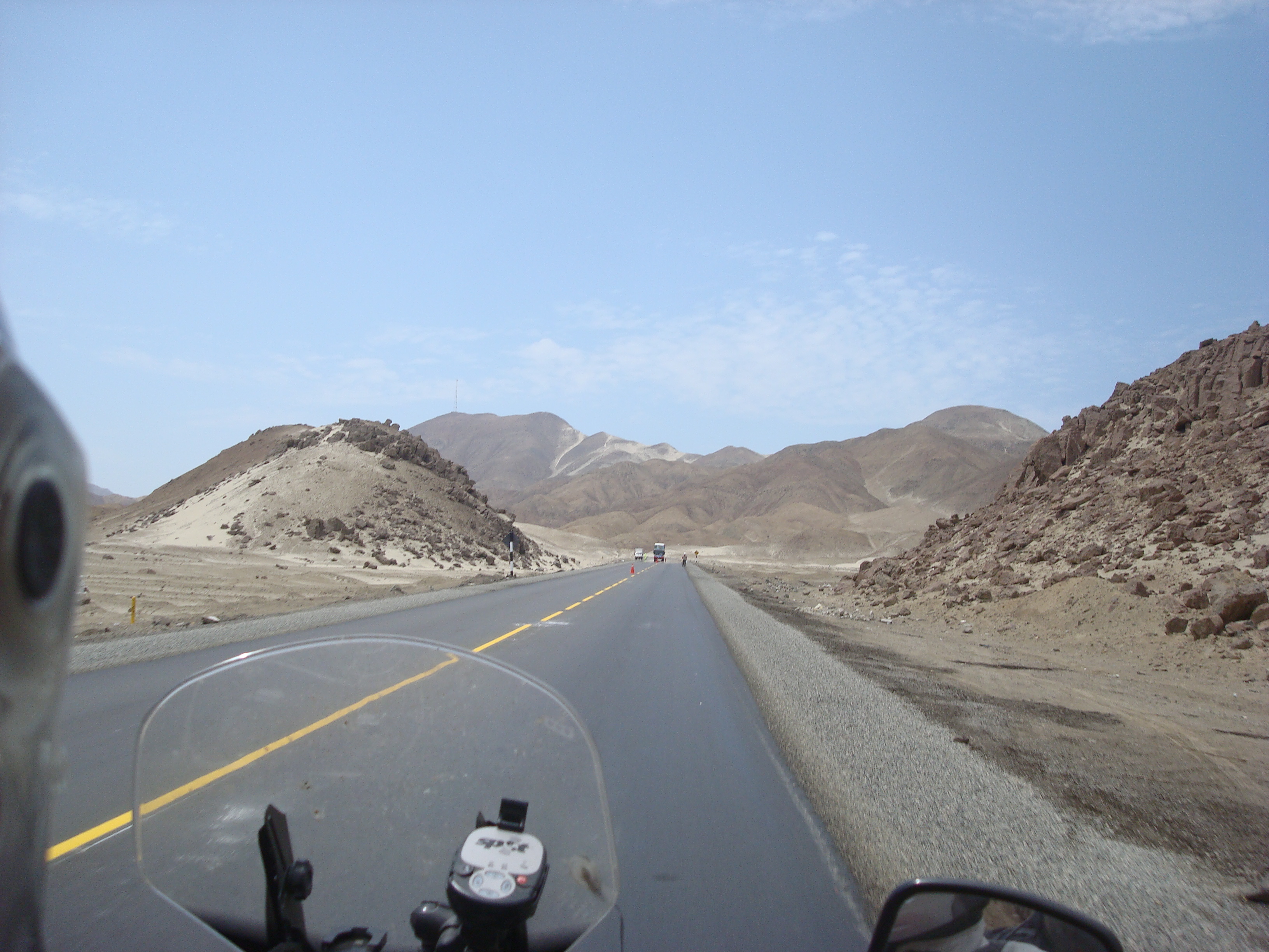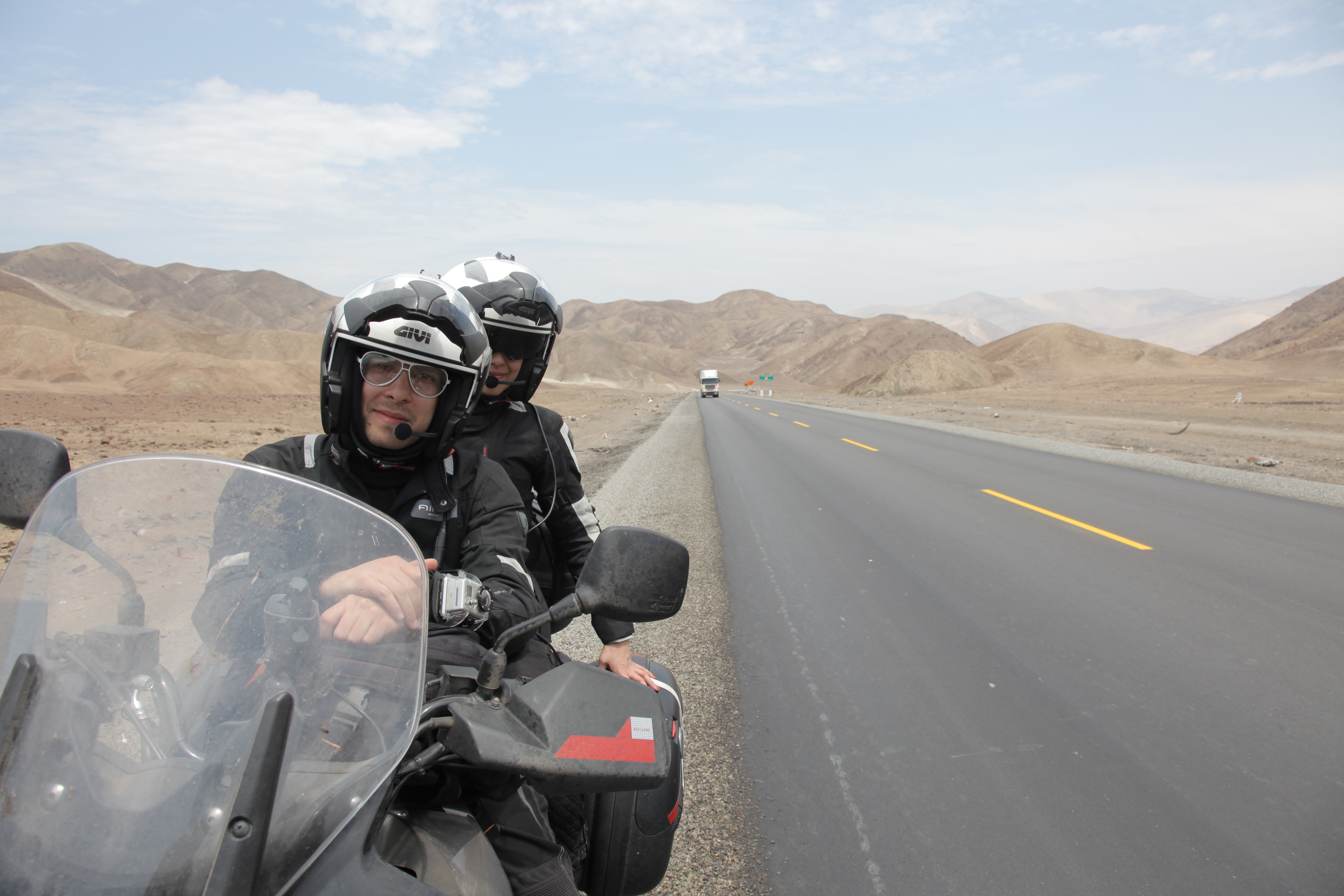 Salimos temprano despues de un desayunito comprado en Tottus, supermercado. La madrugada nos costo a todos, depronto fue el sueño ligero de la noche anterior debido a la incertidumbre del estado de la moto y la futura vuelta del taller. A la salida de Huanchaco nos paro la policia. 6.30 am. Esperando lo peor Camila puso a grabar la camara del casco. Despues de pasarles los papeles que nos pidieron, nos recomendaron ir por la sombrita y seguir! Nos dijeron que nos tomaria unas 8 horas desde alli. Al cabo de algunas rectas desérticas noté que Julio iba bajando el ritmo de a poco, al preguntarle por el intercom, confeso que le estaba dando mucho sueño.