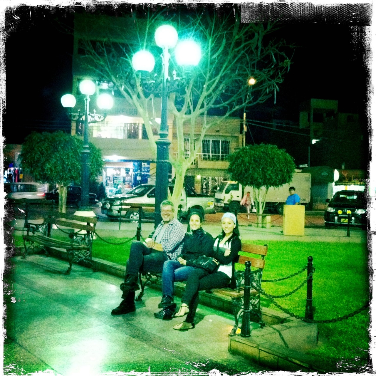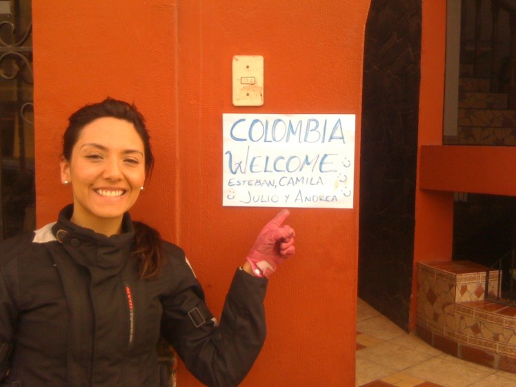 Previamente habíamos cuadrado con Alfonso y Carla vernos en el hotel, y como no sabíamos que tal era, nos advirtieron que si no veíamos la moto de ellos saliéramos corriendo al Casa Andina. Llegamos y no vimos la moto, pero si vimos un cartel en la puerta que nos dió el mejor recibimiento hasta ahora: «Colombia welcome. Esteban y Camila. Julio y Andrea». Una alfombra roja es un pedazo de trapo sucio al lado de esto.
