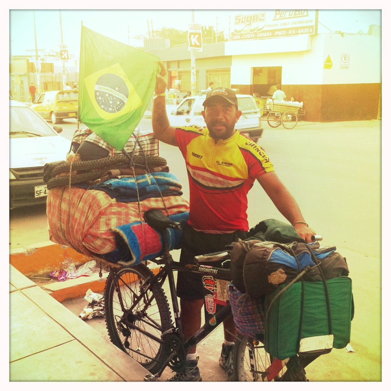 Luego llegó al hotel otro personaje: Edmilson. Un brasileño que los Venezolanos conocieron en el camino. Un viajero que llevaba 4 años y 4 meses viajando por Sur America, y al que aun le faltan 8 meses más de camino y todo en bicicleta!. Si alguien está pensando en este momento, «ese tipo debe tener mucha plata para viajar por 5 años», dejenme decirles que si y no.
