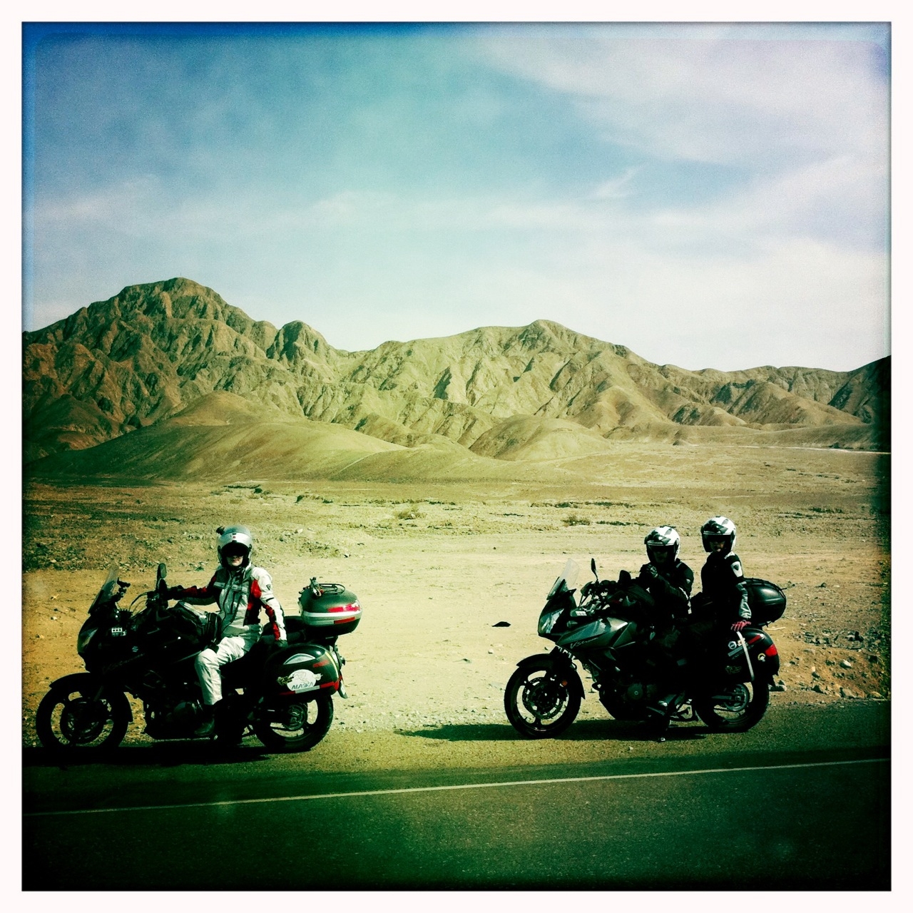 Nos bajamos de los Buggies directo a las duchas, no sin antes escurrirnos, cada uno, un par de litros de arena de entre los calzones. Aun en Cusco, después de Machu Picchu, me salía arena de los pantalones de moto. Ya ahora si listos, bonitos y perfumados, nos montamos en las motos para salir a Nazca.