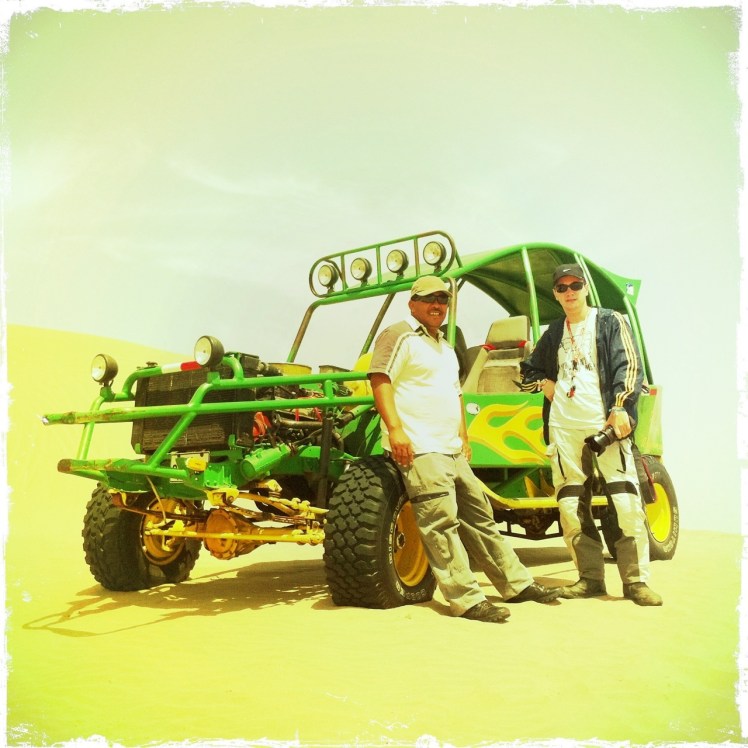 Nos despedimos de nuestros nuevos amigos Venezolanos Alfonso y Carla, porque ellos querían arrancar temprano hacia Nazca y nos montamos en el buggie que nos llevaría a las dunas.
