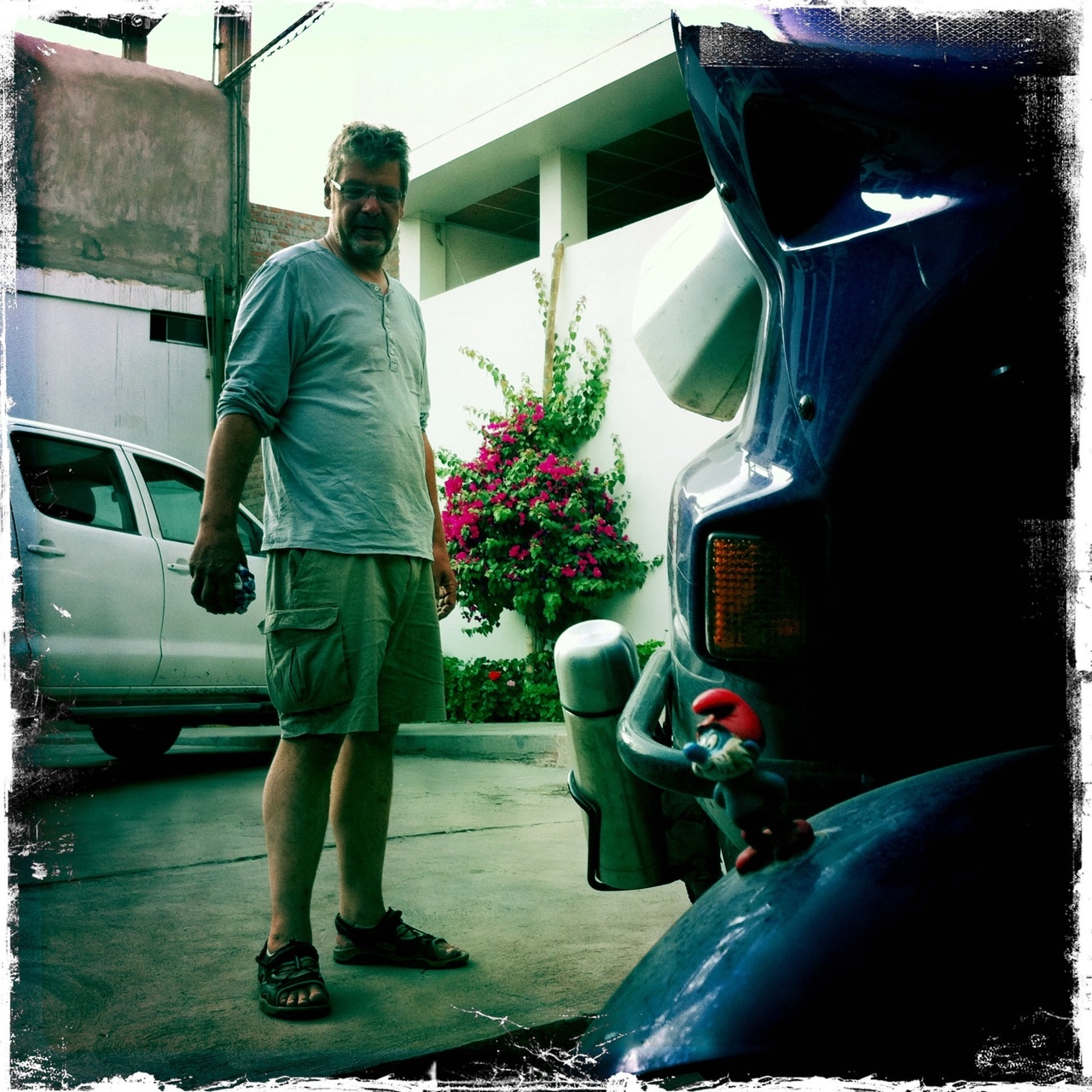 Un tipo de unos 50 años salió a saludarnos dueño de una Transalp con tanque modificado y un protector de la quilla que parecia recortado de un tanque de guerra, construido por el mismo. Tenia un papá pitufo pegado al guardabarros delantero y una letras en vinilo adhesivo pegadas al tanque que decían «El Alemán». Nos contó que le hizo falta pegarle la palabra «loco».