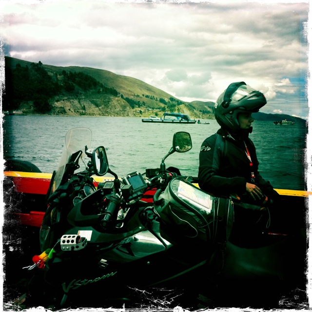 Que mas bien fueramos a Potosi y de Potosi a Uyuni. Nos dijeron que Oruro era horrible y que el tren era de carga, no de pasajeros. Algo no cuadraba en la historia y tampoco teniamos tiempo de improvisar. El buen dato es que la carretera esta asfaltada. Esto es algo que no sabiamos y que hizo que escogiermos este camino en vez de otro. Nos toco igual arrancar via Oruro pensando en que lo que se venia era pura aventura. No solo de moto sino del viaje en si. A la salida de Copacabana hicimos nuevamente fila pero para tanquear en la única bomba en kms. Al consultar sobre la gasolina, a ver el octanaje o si hay de mas de un tipo, la chica que atiende casi no nos entiende. Les cuesta un monton, la gente alrededor nos ve como extraterrestres, entre las camionetas, las pickups, los taxis, toda gente local. Al final la chica nos dice que si hay gasolina. No entiende que le estamos preguntando si hay mas de un tipo. Esto lo dice balbuceando, de manera casi incomprensible. Parece dificil creer que hay una barrera linguistica en Bolivia, pero se ve que la barrera es algo cultural. Seguimos viaje bordeando el Titicaca, un paisaje increible, el horizonte no alcanza a mostrarnos el otro lado del lago. Empezamos a subir nuevamente rompiendo la barrera de los 4000 metros, mientras nos acercamos a un estrecho del lago que hay que cruzar en barcaza. En la bajada, aproximandonos al estrecho, vemos muchos niños que a orillas del camino agitan sus sombreritos mientras hacen un paso de baile, como esperando una moneda o algo. No sabemos bien que significa esto, ni vimos a nadie parar a darles algo. Lo que si vimos, es que a cada auto que pasaba lo acompañaba un baile con sombrerito en el camino. Y a veces no eran solo niños, familias enteras al borde del camino bailando en trance, con sombrero en mano. Finalmente llegamos hasta el estrecho, donde hay un pueblito chico y hay unas barcazas de madera con un motor fuera de borda que cruzan el Titicaca. Al aproximarnos al «puerto» vimos que un chico nos hacia señas de seguir a la barcaza; arranque de una vez para subir cuando en la mitad de la subida veo que hay un hueco inmenso entre la barcaza y la tierra firme donde ya se podía ver el interior de la barcaza. En su interior, habia solamente unos tablones largos cruzados sobre travesaños y entre ellos un hueco que daba al fondo de la barcaza. Me detuve en la bajada para tomar un mejor camino, gran error. No podia moverme… jejeje Camila se habia bajado para grabar la subida. Le tocó ayudarme a quitar las cajuelas para poder maniobrar mejor la moto. Nos taparon el huequito, nos acomodaron los tablones y arranque. Subi a la barcaza tratando de evitar meter la pata en uno de los huecos. Logramos parquear la moto apoyandola en la pata lateral entre un tablon y otro. Cuando mire para atras, Julio ya habia subido fresco y estaba detras mio. El que manejaba la barcaza nos hizo señas de meter las motos mas al fondo de la barcaza, como para meter mas vehiculos. Las corrimos navegando por los tablones mientras esperabamos a ver si arrancabamos. Al esperar unos minutos le preguntamos al muchacho si podiamos arrancar y cuanto costaba la vuelta. No nos entendia. Preguntamos de diferentes formas hasta que lo único que logramos entender era: Esperar y Movilidad. Ni idea. Al volverle a preguntar se iba molestando, se esforzó un poco y nos dijo, estamos esperando que venga otra movilidad chica, que entre en la barcaza para poder arrancar. Ademas, solo de a un par de barcazas cruzan simultáneamente, por lo que veiamos las barcazas de al lado arrancando antes que nosotros. Despues de negociar una tarifa y de ver como subian las «movilidades» a la barcazas de al lado logramos zarpar solos. El agua del Titicaca es totalmente transparente. La vista es sensacional. Una sensacion unica. Unico es tambien ver las otras barcazas cruzando con los buses adentro que parecen el Titanic. Unica es la sensacion del vaiven de la barcaza con la moto erguida mientras pasamos por este estrecho. Una vez llegamos al otro lado empezo la odisea de echarle reversa a las motos entre los tablones y los huecos para poder sacarlas. Entre los 3 fuimos sacando una a una las motos y una vez afuera volvimos a cargarlas. Sin embargo,