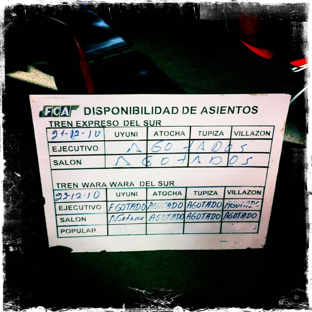 la venida un dia antes habian sido totalmente en vano. Sin embargo, la cartelera decia que todos los pasajes estaban agotados, el viaje se complicaba. Despues de balbucear algunas cosas, el señor de bigote encontró la reserva. Pufffiuuu menos mal. Nos imprime los boletos, a unos con fecha de regreso el 23 y a otros el 24!!! Nos dice que la reserva esta hecha asi. En fin.. despues de unos minutos se arreglo el asunto, pero el desespero iba en aumento. La forma de comunicarse en Bolivia es diferente. Lo hemos vivido intensamente el dia de hoy. Ya con los tiquetes de tren, salimos de ahi a comer en un restaurante que nos habian recomendado a pocas cuadras.