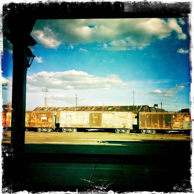 mas, nos llamo la atencion unos bolardos que hay en la mitad de las vias en las areas que no se puede adelantar. Como para asegurarse que no adelante uno ahi. Camino a Oruro, el camino se mantiene en la altura. Remolinos o pequeños tornados nos acompaniaron a nuestra llegada. Un atardecer espectacular con viento nos recibia en Oruro. Llegamos a buscar un hotelito que habiamos visto en internet, el famoso Briggs. El mapa del GPS estaba medio medio, pero sirvio para llegar a la plaza de armas como para empezar a preguntar. Despues de seguir algunas indicaciones el trafico se detuvo, no se movia ni pa´lante ni pa´tras. Camila se bajo a preguntar y habia una plaza de mercado en la calle que impedia el acceso al hotel. Nos toco empezar a buscar otros. El hotel Sucre se veia despedidor, otros aledaños se veian muy pulgosos, finalmente llegamos la plaza de armas nuevamente donde esta el mejor hotel de Oruro. Hotel el Eden. El único problema, 200 dolares la noche!!! JAJAJA estan locos!! Pero esperen, el hotel tiene: Piscina, Jacuzzi, Casino, Supermercado, Internet, Mirador, Restaurante, Estacionamiento, Cine (Harry Potter doblada). Muy completo! Nos atendio creemos el dueño, un señor bajito, de pelo rubio y ojos claros, con camisa de seda transparente, pantalon de lino negro tambien y mocasin, cadena de oro y pelo en pecho. El tipo super amable nos mostro las habitaciones, el casino, nos vendio el cuento completo. Negociamos bastante la tarifa y nos quedamos. Salimos de una por los tiquetes del tren. Razon principal por la que vinimos a Oruro un dia antes de viajar a Uyuni. La ciudad tiene mucha vida! Estan las calles atafagadas, el comercio abierto, la gente por todos lados. Una vez en la estacion, no encontraban las reservas que habiamos hecho meses atras, nos atendieron un par de caracoles, que despues de un rato las encontraron en horarios y sillas raras. Empezabamos a pensar que la reserva de internet y