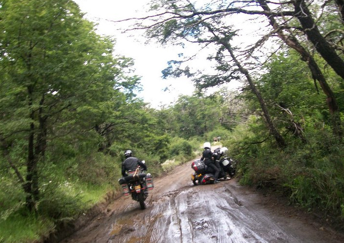 La hosteria Posta del Cazador se habia portado bien con nosotros, pasamos una buena noche, nos prestaron plásticos para cubrir las motos en un galponcito, y para rematar tenian huevos revueltos al desayuno!!! (En argentina la gente desayuna café con medias lunas y ya, no hay nada mas) Posada del cazadorPero aquí nos sorprendieron gratamente con el detalle de los huevitos. La idea hoy es hacer el cruce de los lagos por el camino que pasa por Villa La Angostura, pero con la lluvia de ayer no tenemos idea como esté el camino. Además, Tonny nos viene presionando para que lo acompañemos hasta Ushuaia, plan que ahora, faltando pocos días para que los Viajeros del Sur cambien de rumbo sur a norte, la tentacion es grande. En la entrada de SMDLA vi un ACA, asi que quise hechar un ojo. Estabamos con el grupo y vemos que cuando estamos listos para arrancar Tonny pega un grito, arranca la moto y avanza 2 metros a donde se encuentra una nena en bicicleta de viaje. Era la chica que conoció el 24 de diciembre con otro grupo de gente en San Pedro de Atacama. Una alemana que viene bajando sola y lleva 6 meses arriba de la bici.Con Amigos Se puso a charlar con ella por lo que fuimos con Camila a averiguar pero en la oficina del ACA habia fila y la persona que atendía pareciera que no hubiera hablado con nadie por una decada y se expandía en detalles innecesarios con cualquier oportunidad. Nos iban a dar las 7:00 pm ahí sin saber nada. Volvimos y Tonny y Julio ahora charlaban con una pareja de motociclistas que iban en una BMW 1150 amarilla. Les preguntaron si iban a hacer el cruce de los lagos y se querían pegar. Dijimos que si claro y arrancamos por fin. Salimos por la marina del pueblo que da al lago Lacar Julio, Andrea, Tonny, Horacio, Graciela, Camila y Esteban! El grupo x el cruce de lagosSe nos habia hecho como raro un poco tarde y no sabiamos como era el camino ademas de no tener hotel, aun asi ibamos paseando relajados. Nos pasamos la entrada del primero que se llama lago escondido, demasiado escondido para nosotros, seguimos y el paisaje se ponia cada vez mas alucinante. Llegamos a la entrada de uno que se veia del carajo, se llamaba Lago Hermoso, sin embargo con la lluvia de ayer se veia un poco embarrada la vaina y no tan hermosa; y después de la experiencia de Julio de caerse en destapado como que me dio vaina arrancar de una. Tonny se mandó con Horacio a ver que tal estaba el camino y nos quedaron de avisar, Julio se desesperó y me dijo de arrancar, asi que pa’ lante le dimos. A los 4 minutos nos cruzamos con Tonny que hizo señas de OK. Seguimos adelante pero el camino se ponia cada vez mas aguado y embarrado. Mas barro empezó a salir y con el paso de los autos mas barro se formaba. Llegó un punto en el que el barro estaba ya complicado, habia una montañita de lodo frente a nosotros y no podia frenar, no podia girar, me tocó acelerar suavemente esperando la caída que gracias no sé quien no se dió. Finalmente pasamos el barrial y no quise alarmar a nadie por el radio porque Julio venia pegadito. Sin embargo cuando pasamos el barrial Julio no venía, lo llamé por el radio y no contestó. Le di la vuelta a la moto y avancé un poco, efectivamente Julio y Andrea habian caido en el barrial. Ya estaban de otro lado, Julio fresco como siempre dijo que no fue nada, Andrea….. no estaba tan convencida. Graciela venía tomando fotos y tomó el momento justo! Aquí posteamos la foto.ouch Seguimos con precaución hasta el lago Hermoso, que resultó no ser mas hermoso que los anteriores que habiamos visto pero hermoso al fin. Tomamos algunas fotos y decidimos volver. Andrea a regañadientes volvió a subirse a la moto, con tal mala suerte que Julio arrancó por la mitad de un charco de barro, el único en todo el ancho del destapadito y la moto casi se va al piso otra vez. Hasta aquí llegó Andrea. Se bajó muy asustada y prefirió caminar. Seguimos pasando por el mismo barro ya bajándonos y encontrando un mejor spot para cruzar. Llegamos al pavimento y esperamos a Andrea que venía caminando. Se subió y seguimos el recorrido. La vaina es que mas adelante el pavimento se acababa de vuelta, viene un ripio suave con algunas zonas que estan arreglando y algo de llovizna. No estaba fácil. En un punto a Andrea le volvió a dar como miedo convertido ya en pánico. No la estaba pasando bien, nos tocó parar. Decidimos que lo mejor era parar un auto y que la llevaran hasta la próxima parada asfaltada que hubiera. Después de esperar un rato finalmente un auto la recogió y volvimos a arrancar. Horacio y Graciela arrancaron a toda detrás del auto, nosotros tuvimos que seguir a ritmo de ripio con moto pesada y Tonny iba que se dormía un poco mas adelante. Julio ahí si se tomó confianza e iba relajadisimo por el destapado mas liviano. RipioEl camino es super bonito, cascadas de deshielo adornan el paisaje. Las curvas se abren camino por el bosque agreste que no me imagino lo que debe ser en invierno. Al cabo de un rato llegamos a Villa La Angostura donde ya se une el camino con una ruta asfaltada. Empezamos a buscar y en la primera pizzería a mano izquierda vimos la BMW de Horacio y Graciela, estaban adentro terminando una pizza con Andrea que estaba mucho mas calmada y tranquila. Esperando a alguien que lleve a Andrea!Le entramos entonces al almuerzo ya siendo las 4 o 5 no me acuerdo y arrancamos a Bariloche. En el camino a Andrea le habian dicho que la cosa de hotelería en Bariloche estaba complicada ya que los que la llevaban buscaron por meses una habitación y no habian encontrado. No era la primera vez que nos decían que la cosa de hotelería estaba complicada, es una cuestion muy común en el viaje. Siempre, y con las mejores intenciones, la gente le advierte a uno de los posibles peligros que hay en el viaje, como No encontrar donde quedarse. Hasta ahora no nos ha pasado, siempre hay lugar y no creo que un lugar tan turistico como Bariloche se quede sin algo que ofrecer