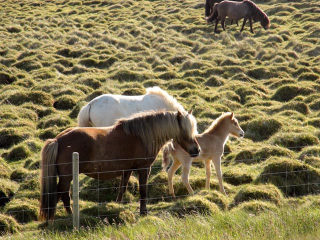 Los pequeños caballos nordicos llegaron aquí junto con los Vikingos hace como mil años y debido al asilamiento la raza se ha mantenido pura.Son caballos muy fuertes,y con muy buenos cascos para poder andar en estos terrenos y un paso original distinto al trote,galope o paso que los hace muy particular.Son dóciles y le dan algo de vida a este paisaje tan inherte.
