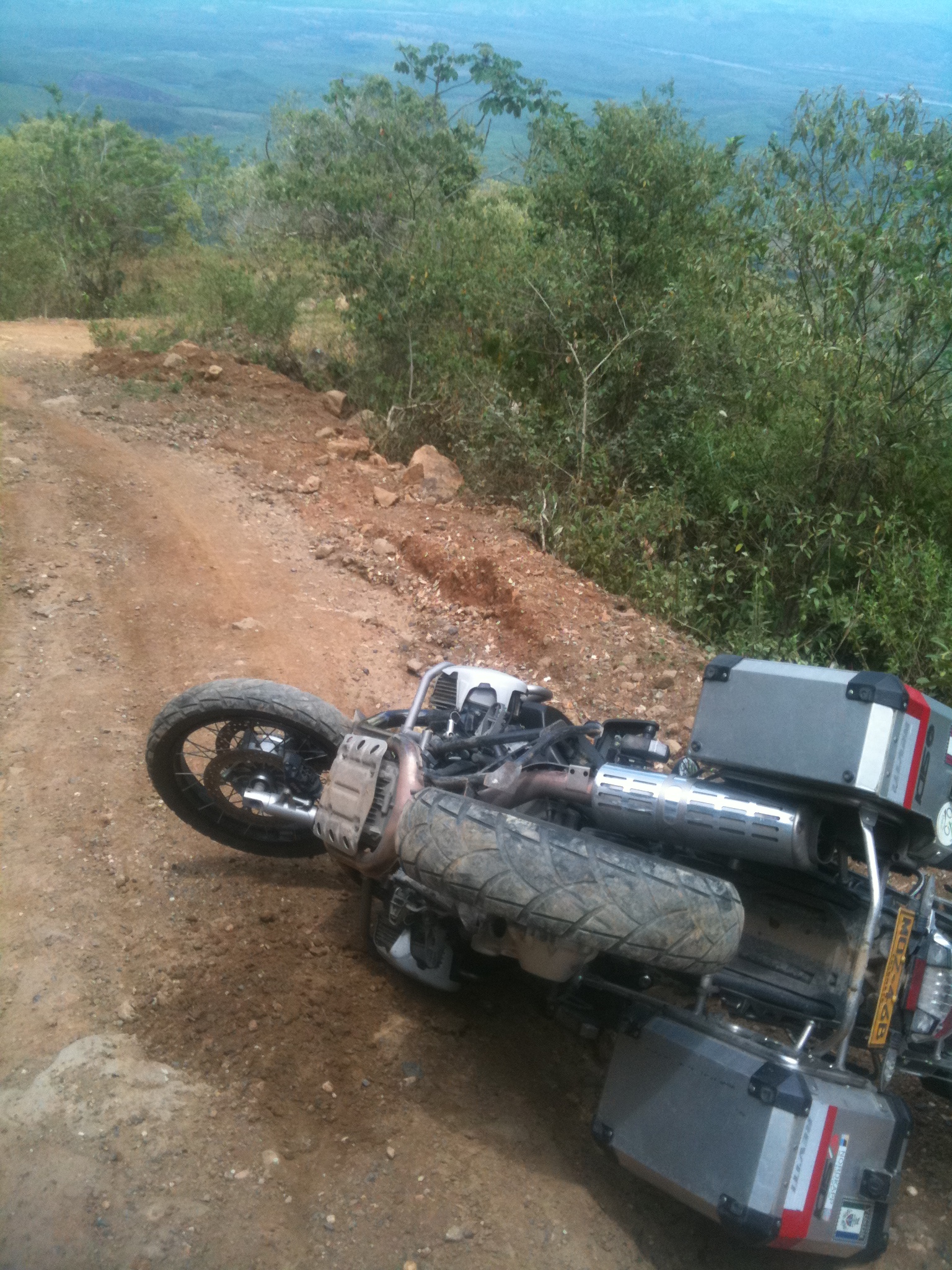 Estos son los retos a superar en los caminos desolados. No pasaba ni un alma, no nos habíamos cruzado con nadie desde Guaduas. Comenzamos la bajada muy tranquilos, despacio y con buena letra, pero cada vez se hacía mas difícil y duro sostenerse. Los resbalones me recordaron que las dos llantas estaban ya un poco lisas, en el final de sus días. Prudentemente le pedí a Gabriela que caminara un poco pues sentía que la moto, por lo pesada me estaba ganando la batalla y no quería correr el riesgo de caerme con Gaba. Ya le había cuadrado toda la serie de «settings» que maneja este aparato: Cuadré la suspension electrónica en normal/hard, para terreno enduroso fuerte (doble montaña), quité el ABS de los frenos, puse el control de tracción en la mitad y me encomendé a todos los santos (pero eso sin Arturo no funciona) y al Sensei de Yoga, Suzuki Yosimonto. Pero nade de eso valió….. Los frenos se fueron recalentando y cuando uno menos piensa, el freno trasero pasa de largo, llegando casi al piso sin detener el aparato, la velocidad va en aumento, la inseguridad tambien y hasta mas veloz aún y no le queda a uno mas remedio que hacer lo que nunca se debe hacer; freno delantero fuerte!!! El resultado es un inmediato beso al piso, como cuando el papa-viajero llega a un pais extranjero.