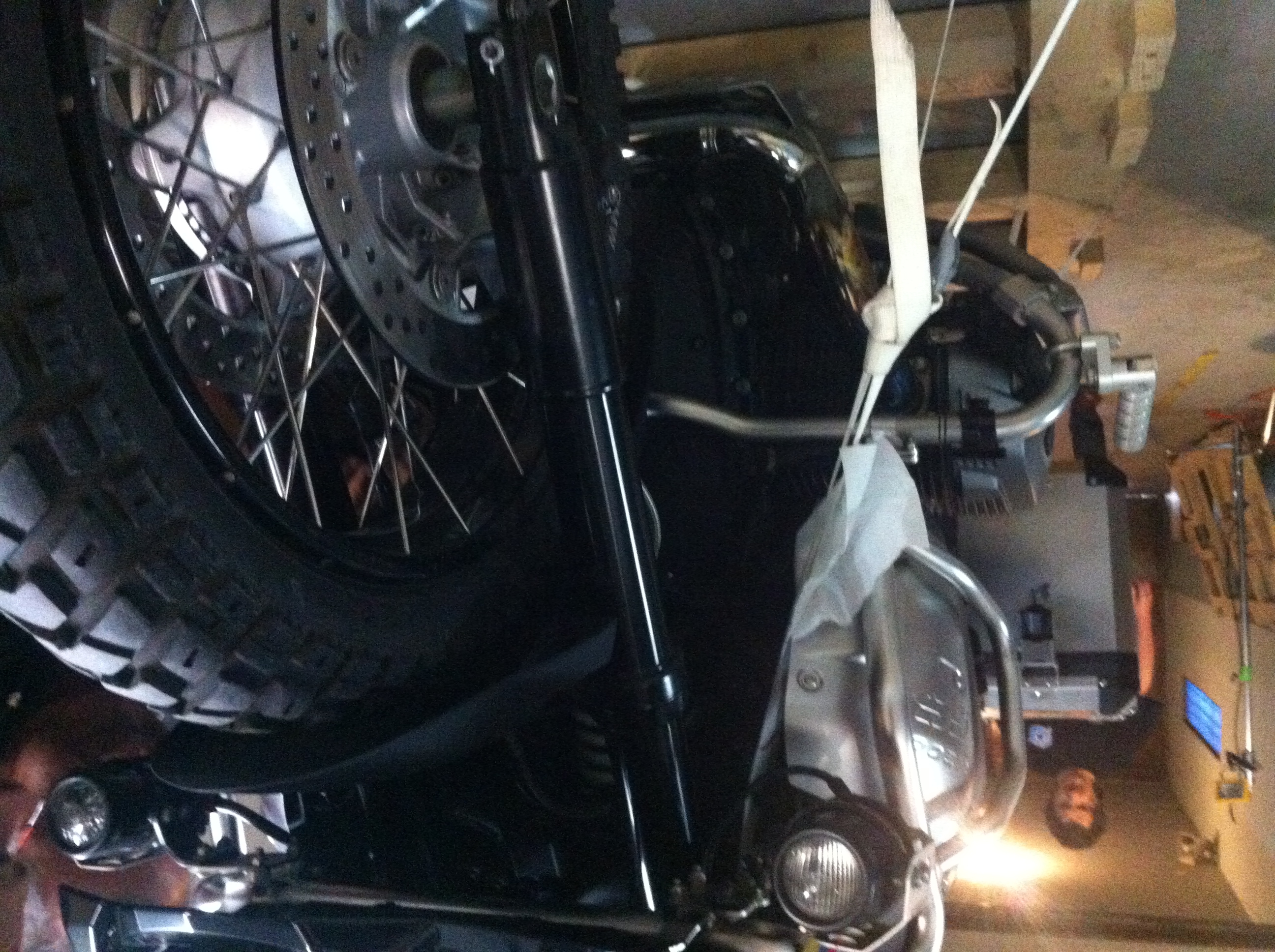 La moto está revisada y lista. Todos los aparejos adicionales ya fueron instalados y probados. Finalmente se desarman sus partes sobresalientes, vidrio frontal, parrilla trasera, etc para compactar el espacio en el huacal.   Se entregó a la transportadora y ya debe estar en su camino a Frankfurt.