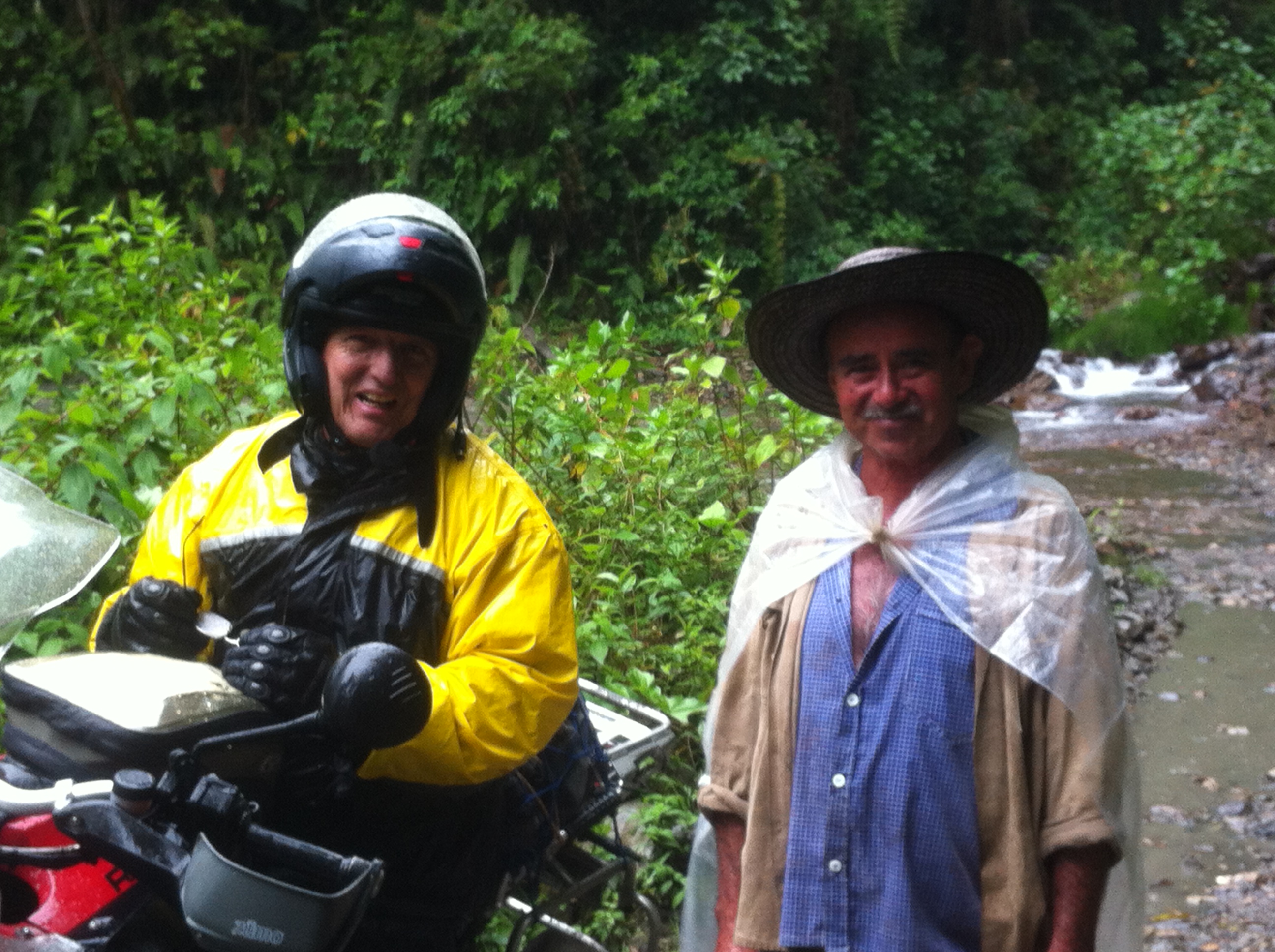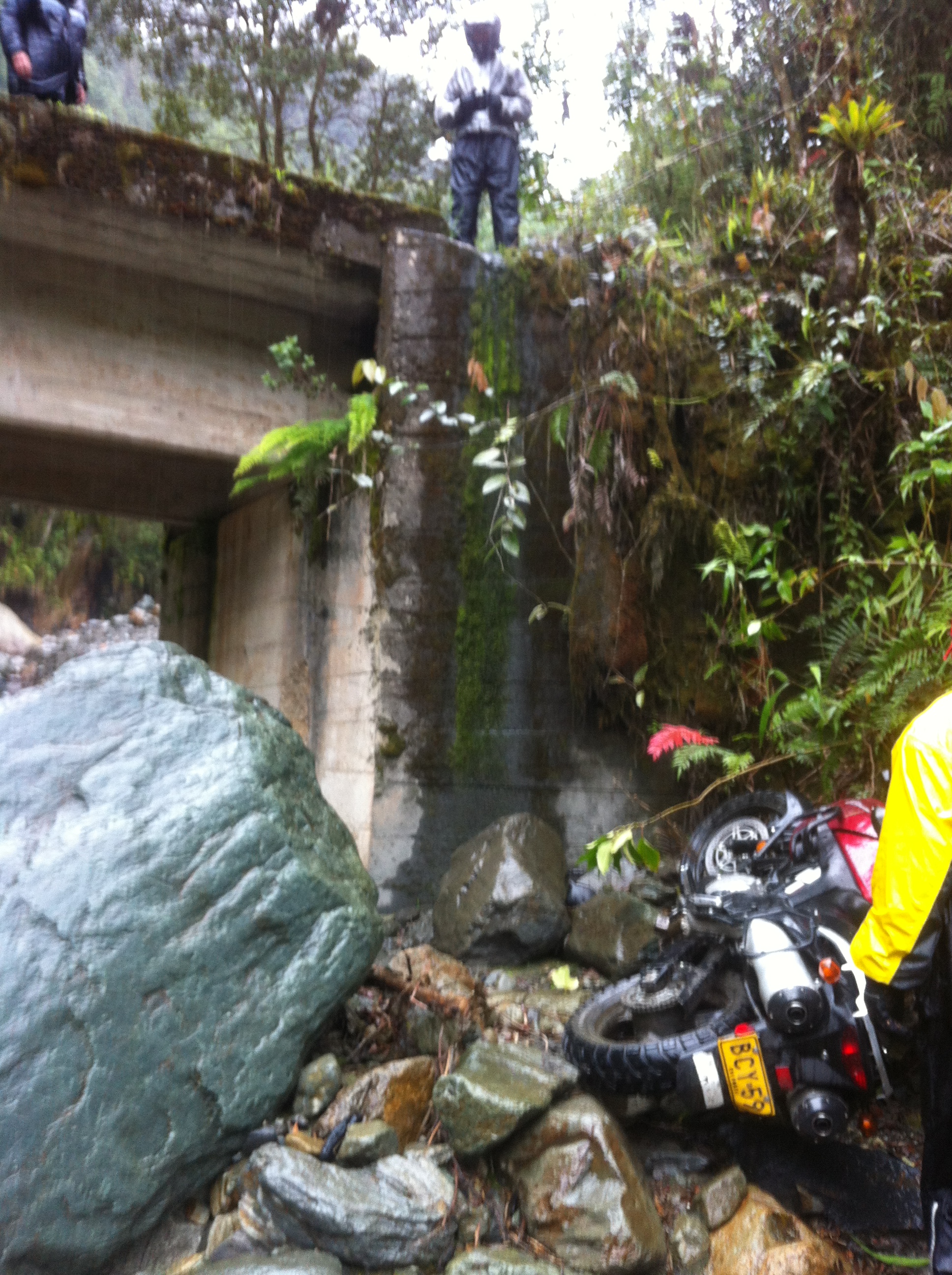 A pesar de sentir mucha tranquilidad por ver a Arturo en perfectas condiciones, sin un rasguño, sabíamos que estábamos metidos en un lío grave. La dificultad de sacar la moto de ese hueco entre cinco era muy grande. Llegamos rapidamente a la conclusión de que era imposible sacarla sin ayuda de una grua ó algo de ese estilo !! Por esa carretera no pasaba nadie… En todo el día, ya bordeaban la 4:30PM, nos habiamos cruzado con uno ó dos carros. Y estabamos decidiendo quien salía para que lado a buscar ayuda, cuando a Don Arturo se le dió el segundo milagrito: apareció una chiva con la gente mas amable y colaboradora que Uds. se imaginen.