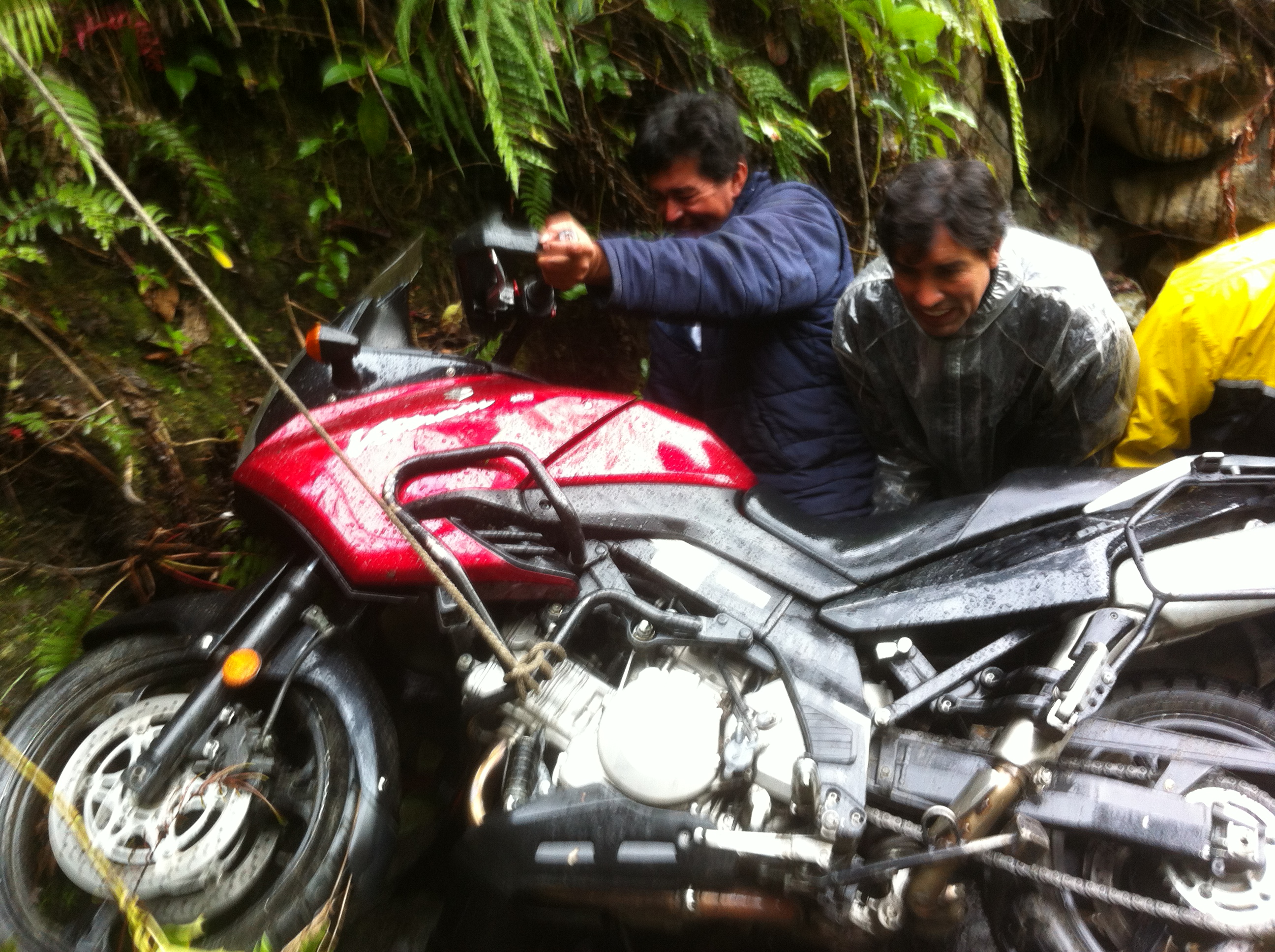 Gonzalo: el titulo que le diste a la cronica es VERIDICO. Como mencionas, hay dos milagros: el primero que no me fuera al hueco…..(se imagina cuantas fracturas..??) ese es el mas importante y en el cual el «Angel de la Guarda» fue protagonista para poderme agarrar de la «brocha»… y el segundo que apareciera la «chiva» con tanta gente, cuerdas para sacar la moto, a la hora precisa…etc. asi que hubo mucha ayuda de arriba. Finalmente nuestra reciente Santa Laura queria continuar haciendo nuevos milagros a los colombianos…