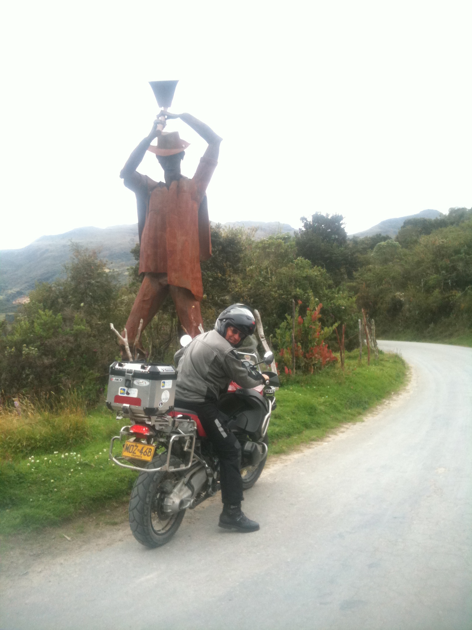 En esta oportunidad fuimos solamente Tonny Strulovic y yo. Por esta razón ya algunos  de los soldados del puesto de control nos «reconocieron» y nos saludaron con mucha amabilidad. Pero el más entusiasta de todos era el cabo Olarte, admirador de las motos, propietario de una DR650 Suzuki y con muchas ganas de viajar por toda Colombia con su mujer cuando le salga la pensión de retiro. Al preguntarle por la situación del orden público nos contó de un atentado en el cual la guerrilla explotó un camión militar. Había sucedido un par de meses atras, en Febrero pasado y en el murieron tres soldados, no muy lejos del lugar donde estábamos. Sobre los «muchachos» nos dijo que era muy poco probable que salieran a vernos, pero que en caso de presentarse un encuentro, nos aconsejaba que les habláramos con naturalidad y les contáramos que hacíamos, etc. así como le habíamos contado a él y a sus soldados de nuestras actividades. Realmente no era el más animador de los consejos, pero seguimos adelante. Inmediatamente después de cruzar el «muñeco»,  como llamaba el cabo Olarte una inmensa escultura de un labrador,
