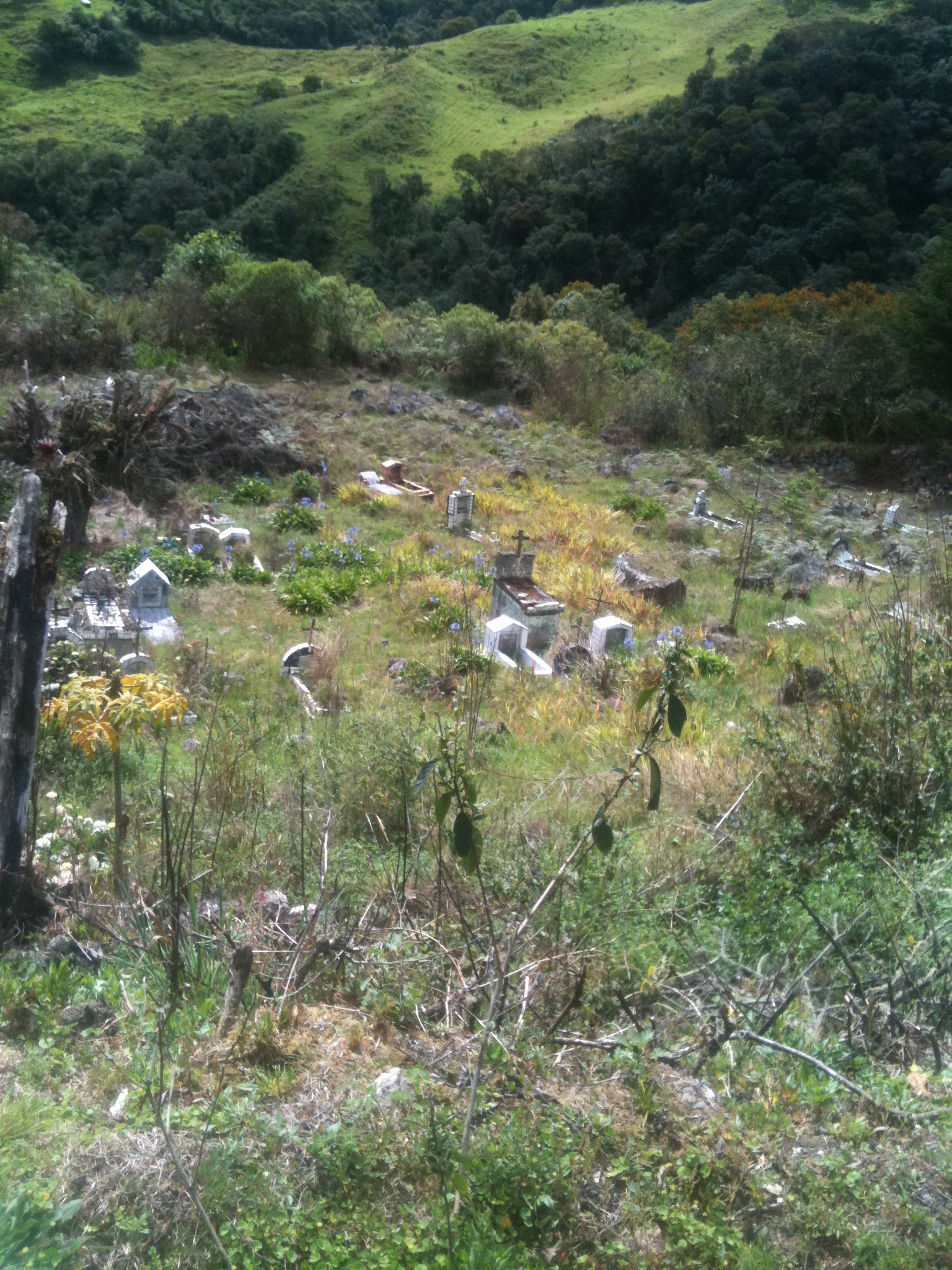 Si por el contrario despues del «muñeco» se toma a la izquierda, comienza un descenso acentuado y  prolongado hasta la pequeña población de Nazareth (esta parte la recorrimos en el primer viaje). Es un pueblo de gente ensimismada, retraída que nos mira con desconfianza y que muestra sin disimulo que han tenido períodos duros con la guerrilla,  por un lado, subiendo desde el Caquetá (este es el camino por el cual se puede llegar a La Uribe) y el ejército trancándolos como puede,  por el otro. Sin embargo, a pesar de que la situación pudo ser tensa por mucho tiempo, en el cementerio medio abandonado y no muy poblado, contamos menos de 20 tumbas. Acá en el primer viaje exploratorio decubrimos nuestro error y  tuvimos que devolvernos unos buenos kilómetros para entrar por donde tocaba.