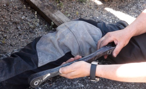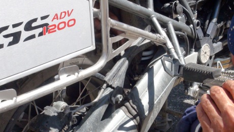 Al borde del camino, endercé la pieza prensándola bajo las ruedas de un carro. No fue mucho lo que logré enderezarla porque comenzó a agrietarse. Evaluando el riesgo de que se partiera, no segui en esa tarea. Le quitamos todo el peso posible a las maletas, colocamos la suspension lo mas alta posible tambien y le apliqué soldadura epóxica para evitar que se siga abriendo. LLamé a Bryan nuestro amigo mecánico de Autogermana- BMW en Colombia y su consejo fue que tratara de evitar huecos…. muy simpático Bryan. Estamos en medio del Pammir, faltan mas de 480 kms de destapado, pasada de rios, arena, ripio, rocas y vaya a saber que mas….»trate de evitar coger huecos» me quedó sonando en la cabeza… muy chistoso Bryan… si supiera donde estoy….