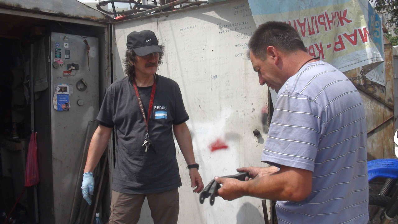 No esta mal…. el único tema es que no se si entendieron que toca enderezar antes de soldar… Ali dice que lo suelden que el lo endereza en su taller… yo que lo enderzen antes… y Leslie me ayuda … yo me llevo a Ali y él entra de nuevo al «taller» y le dice a los dos gigaantes rusos, vestidos con ropa militar que lo enderezen primero….conclusion … 80% de posibiidades que hayan entendido…