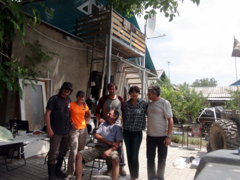 Memo resulta ser un Italiano que vive desde hace unos meses en Bishkek, con una Kirgystani y se dedica a alquilar motos y dar alojamiento en su casa… El patio esta lleno de cuatrimostos de Slovaquia, motos de Turkia y un par de carros de Italia.