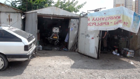 Empezamos a dar vueltas por Bishkek para buscar a ver quien suelda la vaina… Ali no dice para donde debemos ir… yo le voy preguntando y desde su nube de alcohol mira por la ventana, y da ordenes que le voy traduciendo a Leslie… Finalmente llegamos a un sector donde a todas luces arreglan autos…otra sucesión de casetas metálicas, vagones, containers que se usan como taller, casa y oficina….y en uno de los sitios finalmente dicen que si… que la dejemos que en dos horas volvamos…