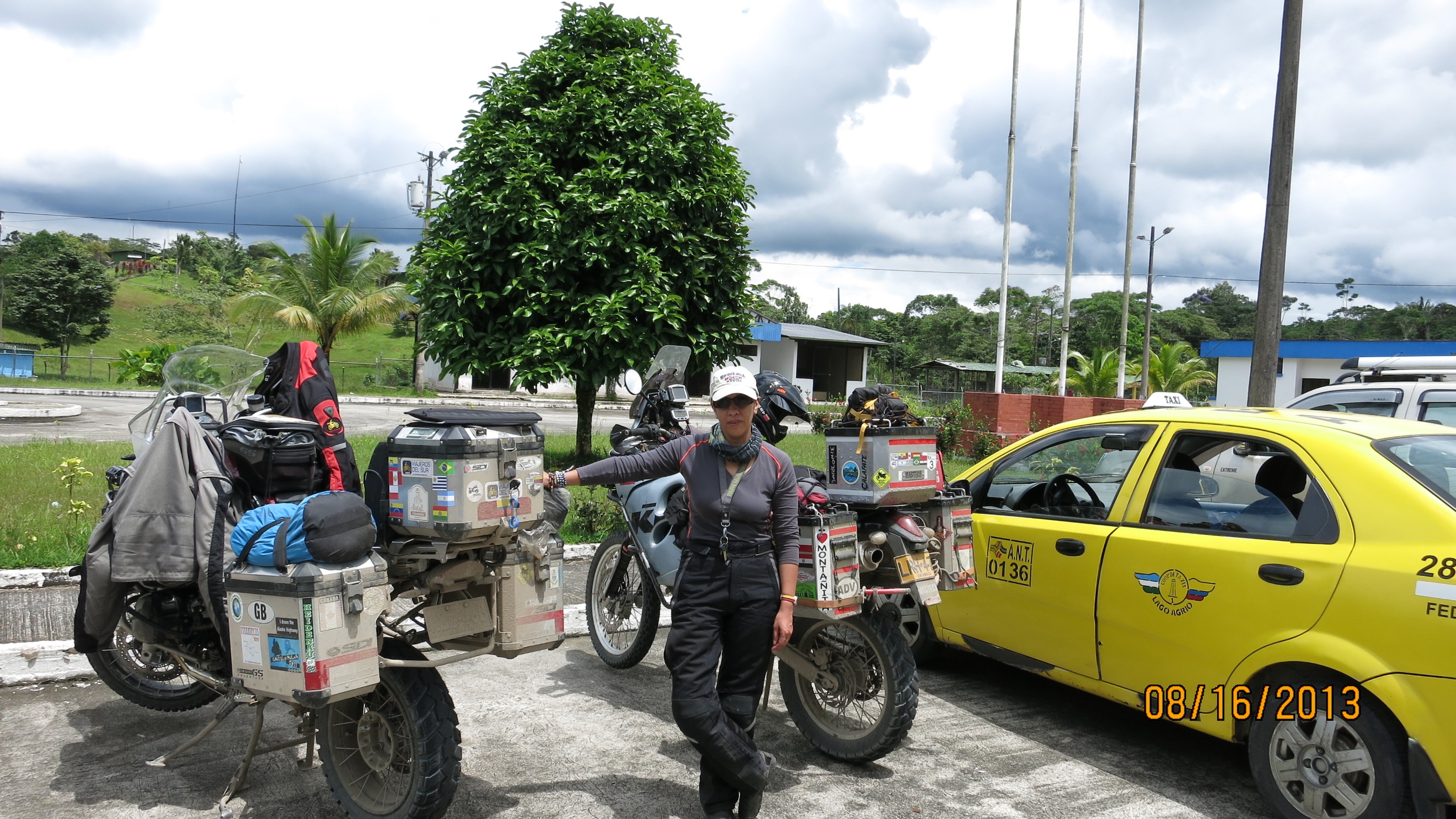 La salida de Colombia, esto es, el trayecto de Mocoa a la frontera es un desastre. En primer lugar fuimos hasta Puerto Asís, pues nos habían indicado que era necesario tramitar un permiso de salida de las motos ante la Dian, para evitar problemas con el permiso de internación en Ecuador. Allá fuimos a parar y a perder un tiempo precioso, pues no sirvió de nada. Desde Asís hasta la frontera de San Miguel hay una trocha desagradable, pues hay caminos destapados muy agradables por donde se puede caminar, pero en esta no es posible. Mucho cascajo suelto, mucha piedra suelta. Están tratando de trabajarle a la en cementada de este pedazo. No se si eso es peor. Me encontré de frente una losa de cemento! El resultado es fatal. Un sumido en el Rin y pérdida de presión permanente. Al llegar al Ecuador el contraste de carreteras es enorme y vergonzante. Le da a uno pena de nuestros políticos y contratistas corruptos que se han robado por décadas estos recursos. El puesto fronterizo esta un par de kilómetros dentro del vecino país y se encuentra la agradable sorpresa que en el mismo lugar funcionan las oficinas de migración y aduanas de ambos lados, al mejor estilo de los puestos fronterizos de Argentina-Uruguay, como países hermanos. El proceso de inmigración de ambos lados no nos tomo más de 5 minutos. Pero el de aduana para las motos fue otro cantar. Los funcionarios ecuatorianos acaban de salir a almorzar y mientras regresaron, se desperezaron y llenaron el formulario, dos horas de espera!!
