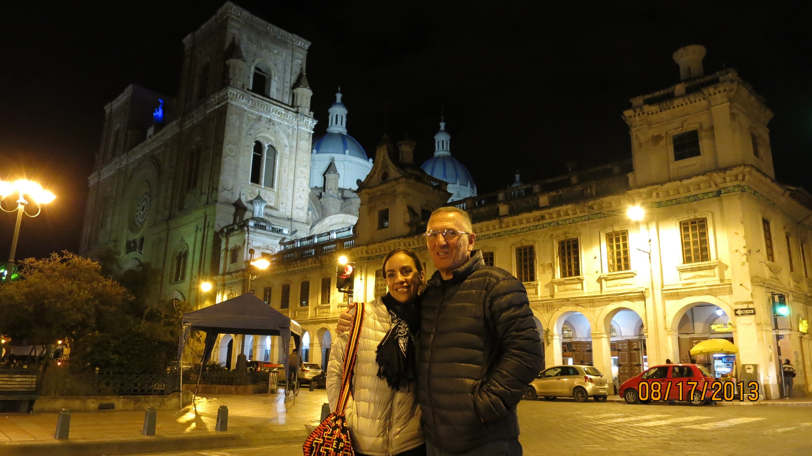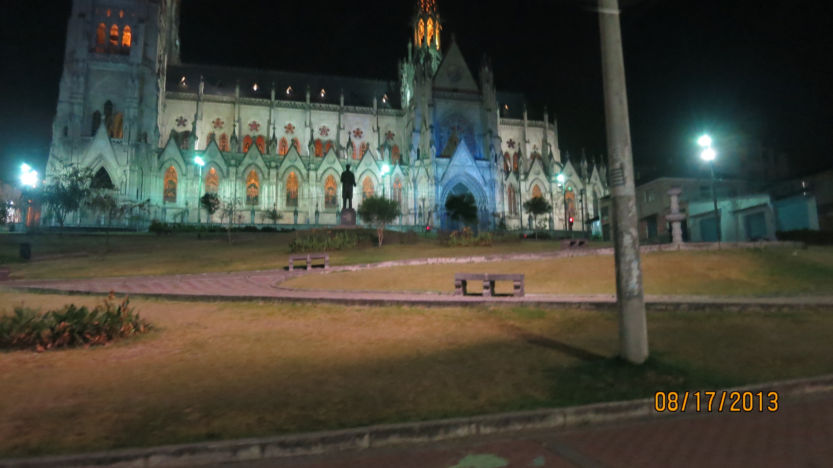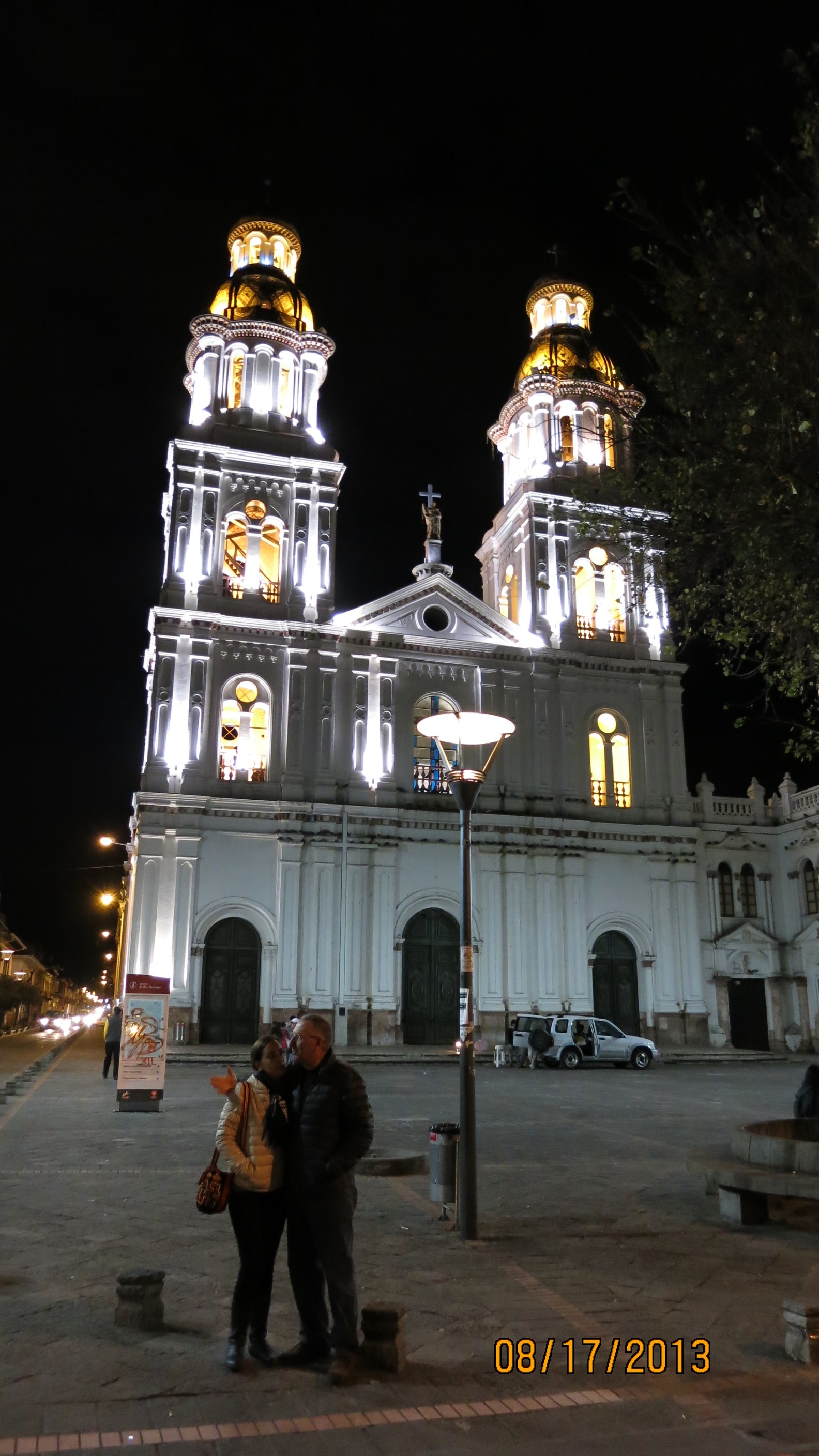 Así lo hicimos y rodamos juntos hasta el medio día, almorzamos en un parador de Cuy, caldo de gallina y sopas de menudencias como únicas opciones y nos despedimos. Seguimos hasta Cuenca, en el tercer día de lluvias esporádicas en la Ruta de los Volcanes. Los majestuosos Cotopaxi y Chimborazo que le dan su nombre no se dejaron ver, pues estaba muy nublado. Llegamos justo a tiempo, tipo seis de la tarde. Dando la vuelta inicial me encontré un colega, Juan Carrasco, quien llevaba su moto KTM en un trailer. Me acerqué a preguntarle por un Hotel y la respuesta no se hizo esperar: «Síganme «. Nos llevó a súper hotel de un amigo suyo. Tonny entró a preguntar y salió un poco aburrido. La tarifa estaba un tanto despedidora y por fuera de presupuestos. «Denme un minuto, llamo al dueño» nos dice el amigo Juan. Y en cinco minutos teníamos un descuentico de más del 50%. Gracias, Juan ! Quedamos hospedados a media cuadra de esta iglesia: