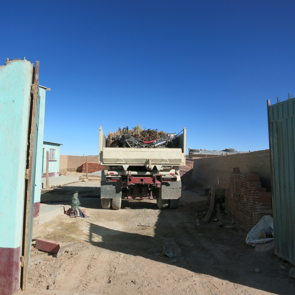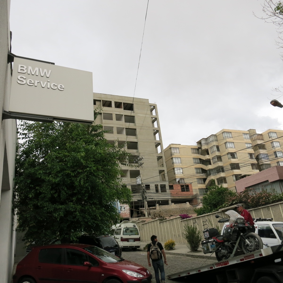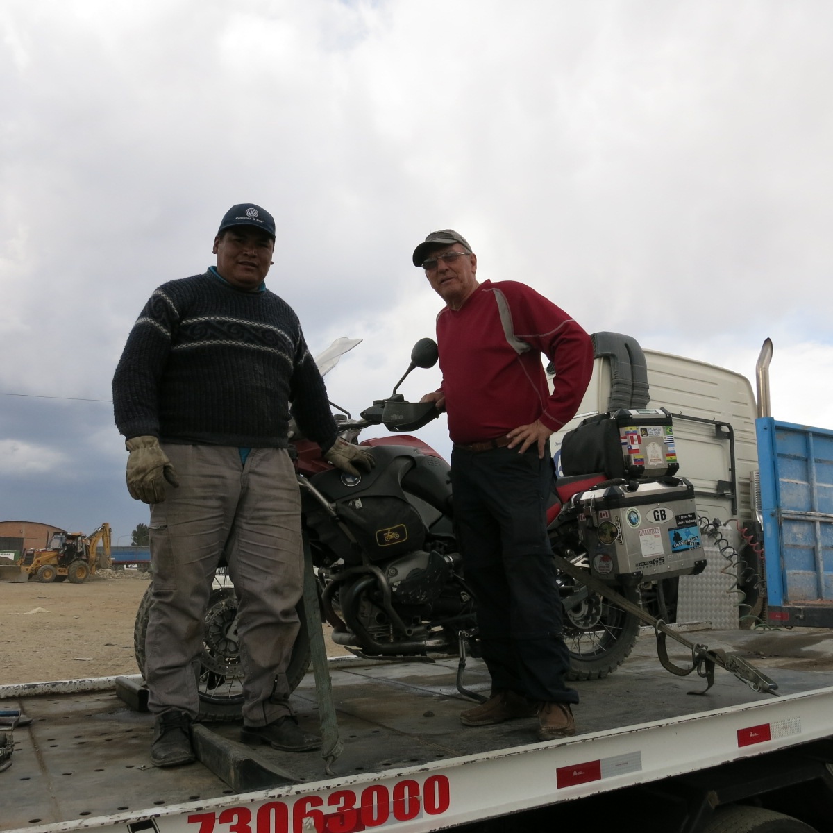 Por otro lado, el camión que traía la moto comenzó con sus problemas y demoras, debido a permisos y trámites. Yo había tenido que sacar en la Policía de Uyuni otro permiso para la moto. Nos comunicábamos al celular del chofer y nos confirmó que no podía entrar a La Paz, por su tamaño. Entonces nos tocó conseguir otra grúa, más pequeña, en la que nos colaboró amablemente el Sr. Bernardo, para recoger la moto en El Alto, casi a 20 kms del destino y traerla finalmente al BMW Service.