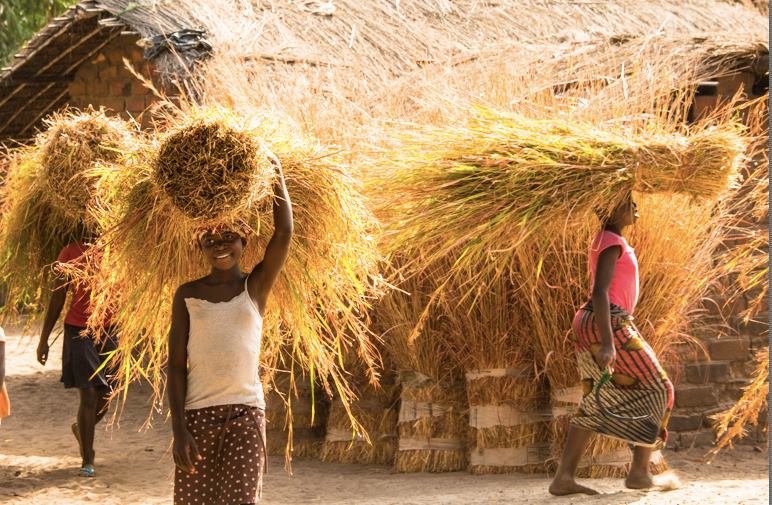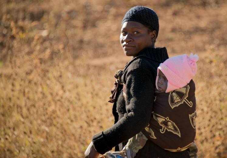 Invariablemente las mujeres cargan un niño a sus espaldas y algo en la cabeza…