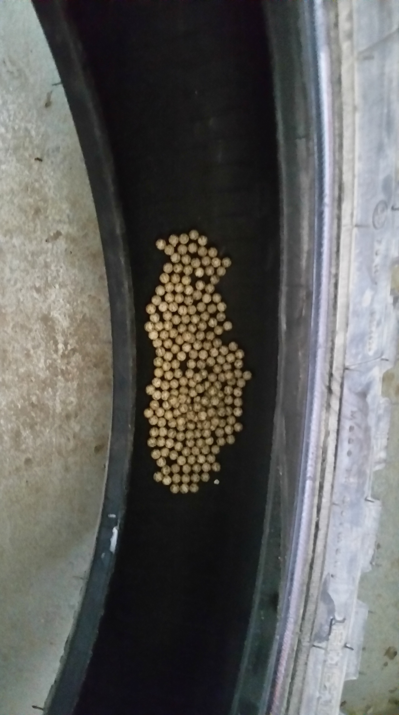 Liran trabajó la llanta trasera en una Superteneree 1200 por 23.000 Kms  y me ofreció la foto. Dice que la duración de su llanta se la acredita a un sistema de “Balanceo Dinámico” que consiste en colocar dentro de la misma una veintena de canicas ó bolas no muy grandes  de cerámica que permanentemente están rotando con la llanta.