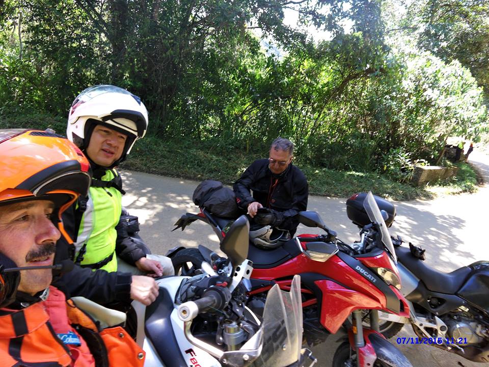 El grupo lo conformaban seis motos de distintas marcas, había KTM 1.190 (Jorge Uribe), Honda Varadero (Nicolás García), Superteneré (Javier Trujillo), dos BMW F800 (Jaimir Hurtado y Juan José Caro) y por supuesto, La Embajadora Roja llevando la representación de Ducati. Hasta la primera parada en Barbosa, como Uds saben, el ritmo es de velocidad alta y constante, en la doble calzada a Tunja. Por tanto, cuadré la moto en la forma de manejo “TOURING” con la potencia del motor intermedia (130 hp aprox). Aún así, el rendimiento es muy bueno y nunca se siente quedada o “colgada” con relación a sus compañeras de viaje. Despues, en la carretera de Tunja a Barbosa y después hasta San Gil, que son rutas de doble-vía, con camiones lentos, buses y particulares de paseo, la potente aceleración se puede sentir mejor en los momentos críticos. Esto es, permite sobrepasos con mucha seguridad, respondiendo con tranquilidad cuando se requiere aceleración rápida. Esto genera en el piloto mucha confianza.
