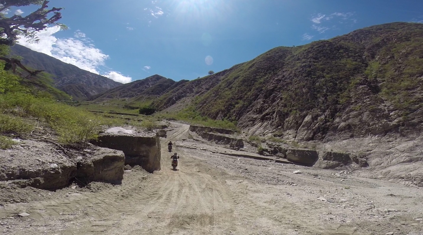 Personalmente cambié parte de la programación que viene por defecto para el modo de manejo Enduro y me funcionó muy bien en las distintas condiciones de terreno de esta travesia. Primero, le dejé el ABS con intervención adelante, pero desconectado atrás. Esto sirve mucho en bajadas pronunciadas, en las cuales de otra forma es «prohibido» usar freno delantero. En este caso se puede usar moderadamente, pero ayuda mucho. Por otra parte le desconecté totalmente el control de tracción. El «default» viene con una intervención baja, nivel 3, pero en subidas muy fuertes me cortaba el paso de combustible y eso alcanzaba a incomodar. La suspension de cada eje se puede colocar en uno de estos 5 niveles: Muy Suave, Suave, Normal, Duro o Muy Duro. Dadas las condiciones de viaje las puse ambas en MUY SUAVE y vi como se exigían al máximo observando el recorrido de los telescópicos. Funcionó muy bien. Por último, como mencioné arriba, colocamos la llanta HEIDENAU K60 Scout 170/60 R17 atrás y una HEIDENAU K73 120/70 17 adelante. Porque la autorización de manera experimental ? Porque en el caso de la llanta trasera el ancho es un poco menor. La original es 190/55. Han funcionado muy bien para lo que nos hemos propuesto.