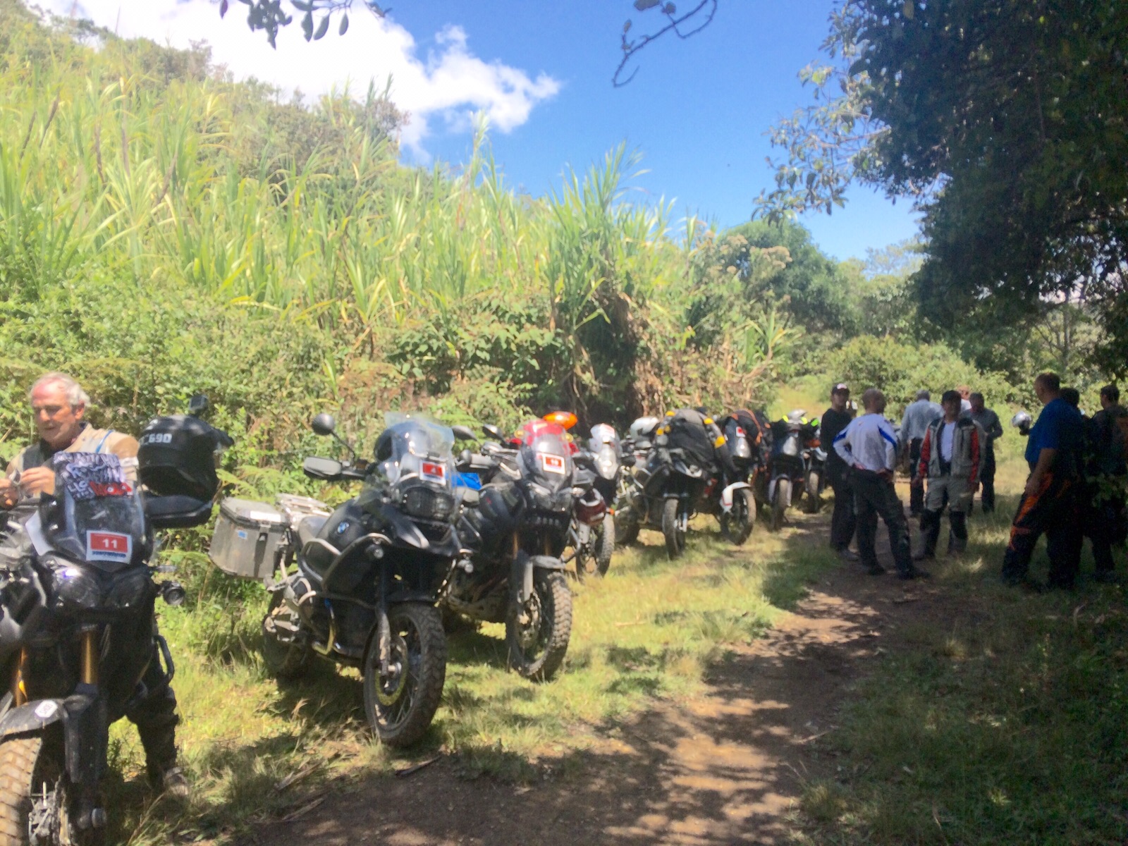 Las caídas se hicieron mas frecuentes. Y el ejercicio de levantar la moto era agotador por el calor. Adicionalmente, una moto caída genera congestión, los que van atrás pierden el impulso y como esto es en las subidas mas fuertes, volver a arrancar es bien trabajoso. Es decir, todo se va volviendo un círculo vicioso: _ Entre mas agotado, mas posibilidades de caer de nuevo… Otra caída y mas agotado queda el cliente _. El resultado final fue que 5 motos adicionales desistieron de continuar, dieron media vuelta y regresaron por donde entramos. Así, se completaron 8 bajas en total. Y por lo que supimos despues, bajando tambien algunos repitieron las mismas caídas que les quitaron el aire subiendo…. Afortunadamente la Embajadora no le pidió a este cronista que la levantara ni una sola vez, en esta segunda jornada.
