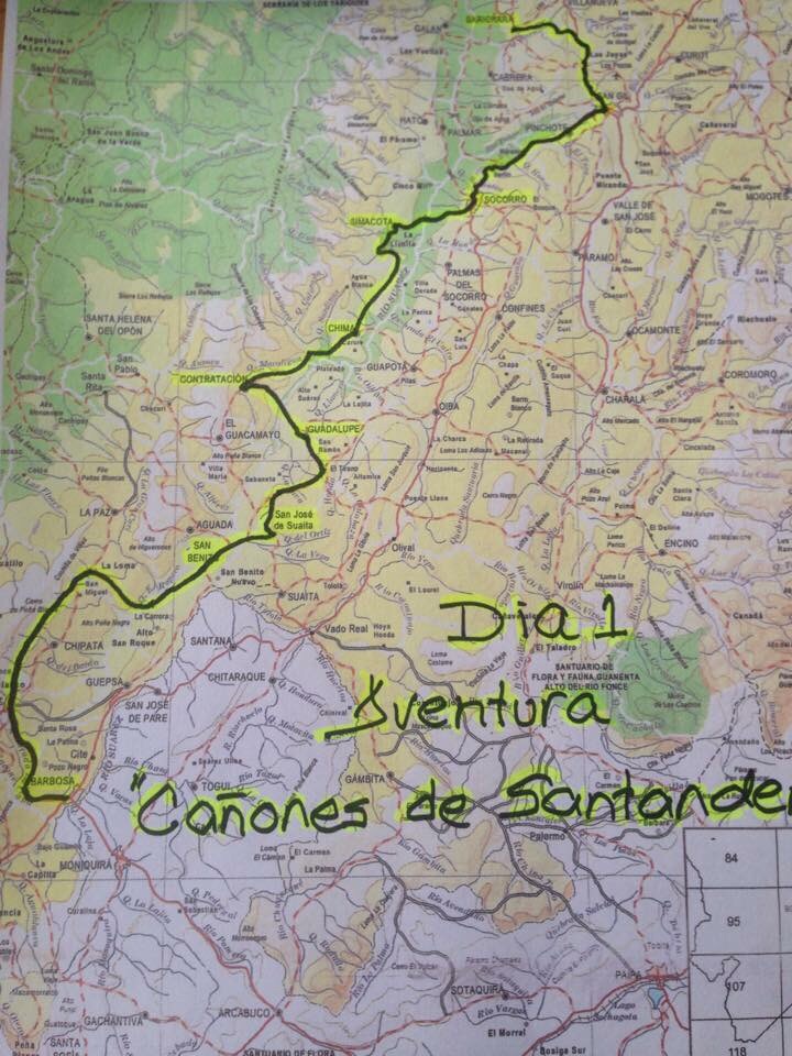Total hacia las 7:00PM estábamos llegando a Guadalupe, donde nos esperaban con el almuerzo. Las dos cajas de bocadillos que repartió Roberto Zuleta durante el día no fueron suficientes para calmar el hambre que produce el ejercicio. MotoRaid Adventure había encontrado y contratado la alimentación en una finca a la cual se entraba por un caminito clásico de predio rural, con dos huellas sobre pasto en bajada pronunciada. No se podía apreciar mucho el paisaje circundante por la oscuridad que ya reinaba a esa hora. Frente a la casa campesina, habían preparado en unas mesas al aire libre un piquete típico santandereano, con carne oreada, pepitoria y demás, acompañado de una deliciosa naranjada endulzada con panela. Dura combinación que hizo estragos estomacales en los días siguientes, en un 50% del grupo. La salida fue muy simpática. En mitad del almuerzo comenzó a tronar y simultáneamente comenzaron a caer unos goterones gigantes anunciando un aguacero. Recordando la entrada en pasto y lo resbaloso que se pondría, salimos en estampida !! Los últimos en salir ya no lo lograron tan fácil, se cayeron algunos y acumularon puntos en su historial de daños. Escampamos en el pueblo un buen rato mientras salían los atorados en la finca y de ahí tomamos una salida directa a Oiba, (este era el plan B para el caso de presentarse demoras, y la demora ya era de varias horas). Tomamos luego la ruta nacional, normal y asfaltada, a San Gil y Barichara, a donde llegamos poco antes de las 11:00 PM. Fue un día pesado….